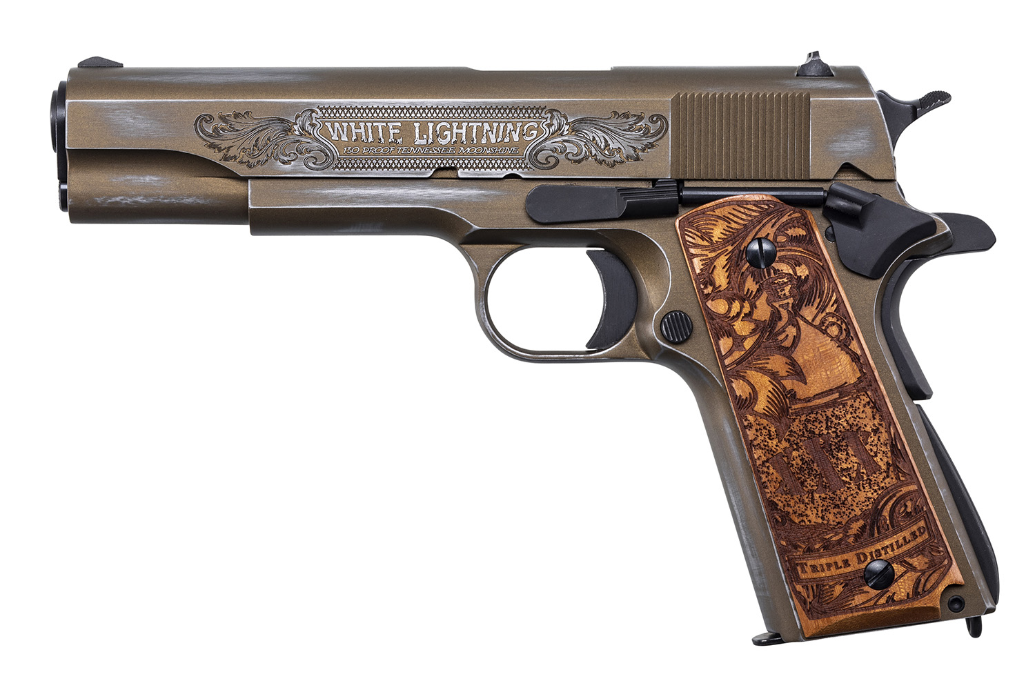 Auto-Ordnance 1911BKOC9 1911-A1 Bootlegger 45 ACP 5″ Barrel 7+1, Distressed Burnt Bronze Cerakote Steel Frame, Engraved Slide, Engraved American Walnut Grip, Manual Safety