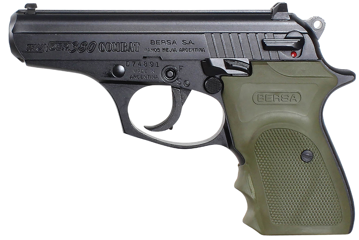 Bersa T380MC Thunder Combat Micro-Compact Frame 380 ACP 8+1, 3.50″ Black Steel Barrel, Matte Black Serrated Steel Slide & Aluminum Frame w/Beavertail, Olive Wrap-Around Grip