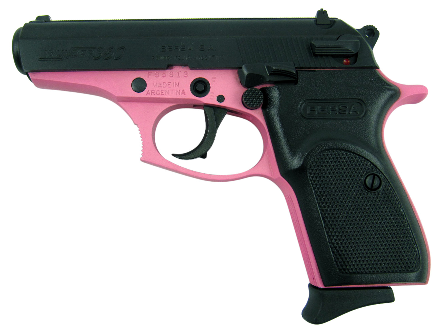 Bersa T380PNK8 Thunder Micro-Compact Frame 380 ACP 8+1 3.50″ Pink Cerakote Steel Barrel, Matte Black Serrated Steel Slide, Pink Cerakote Aluminum Frame