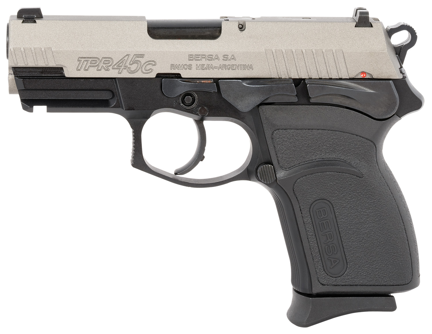 Bersa TPR45CDT TPRC Compact Frame 45 ACP 7+1, 3.50″ Black Steel Barrel, Nickel Cerakote Serrated Steel Slide, Matte Black Aluminum Frame w/Picatinny Rail, Ambidextrous