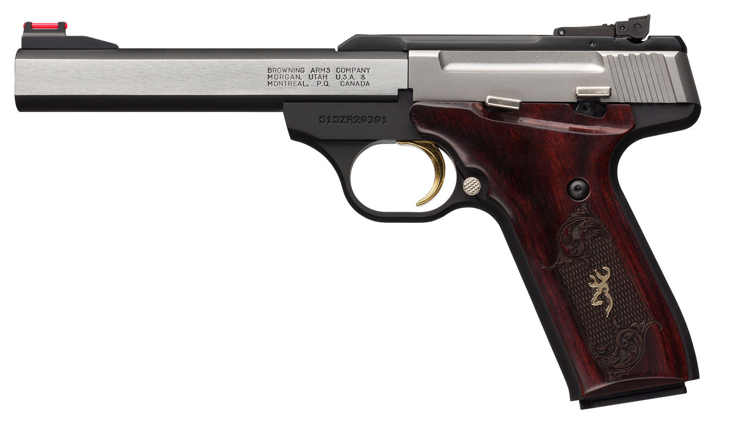 Browning 051543490 Buck Mark Medallion 22 LR 10+1 5.50″ Blackened SS Slab Side Barrel, Stainless Steel Serrated SS Slide, Matte Black Aluminum Frame, Checkered Rosewood w/Gold BuckMark Inlay Grip