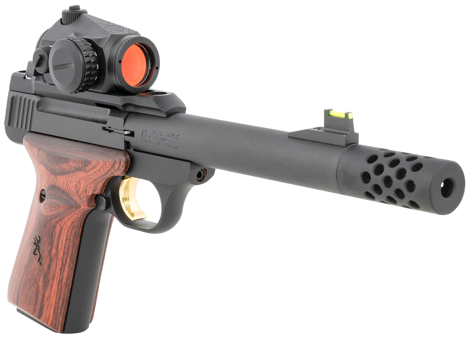 Browning 051580490 Buck Mark Hunter 22 LR 10+1 5.90″ Bull/Threaded/Muzzle Brake Barrel, Matte Black Serrated Steel Slide & Aluminum Frame Laminate Cocobolo Grips, Vortex Crossfire Red Dot