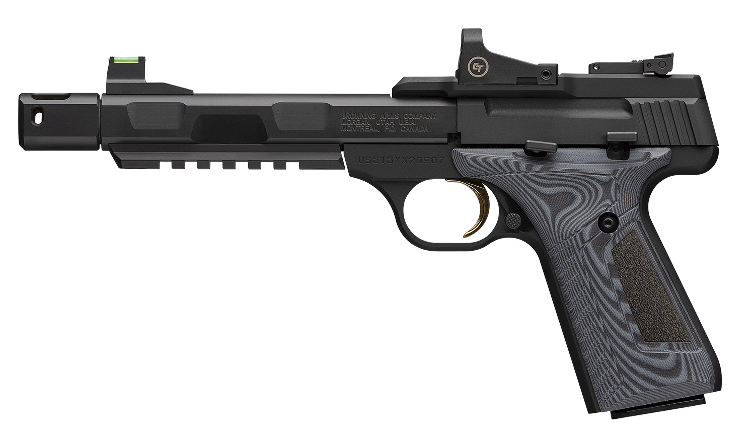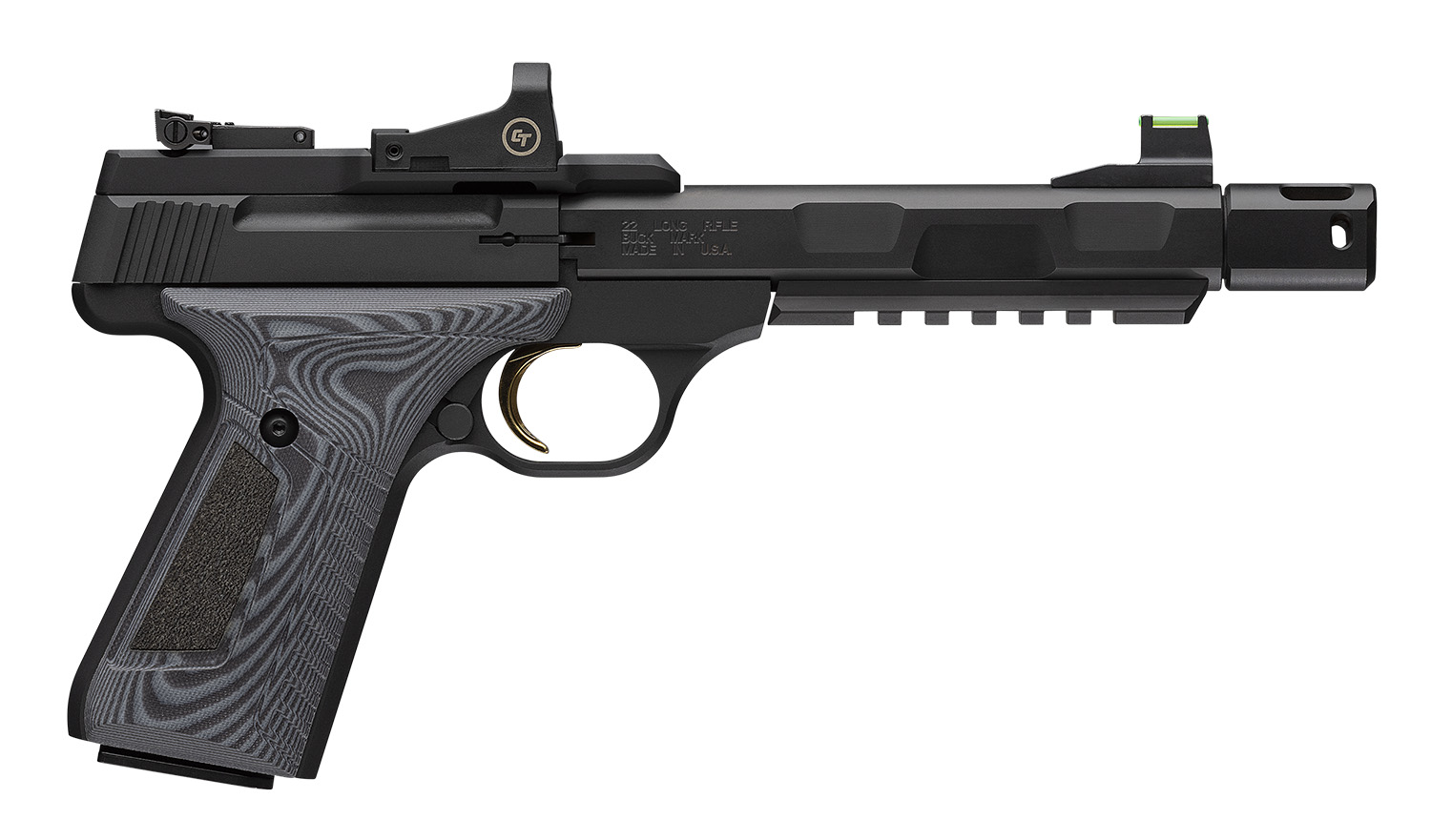 Browning 051596490 Buck Mark Contour Pro w/Red Dot 22 LR 10+1 5.90″ Matte Black Steel Threaded Barrel, Optic Ready/Serrated Slide, Matte Black Aluminum Frame w/Picatinny Rail Crimson Trace Red Dot