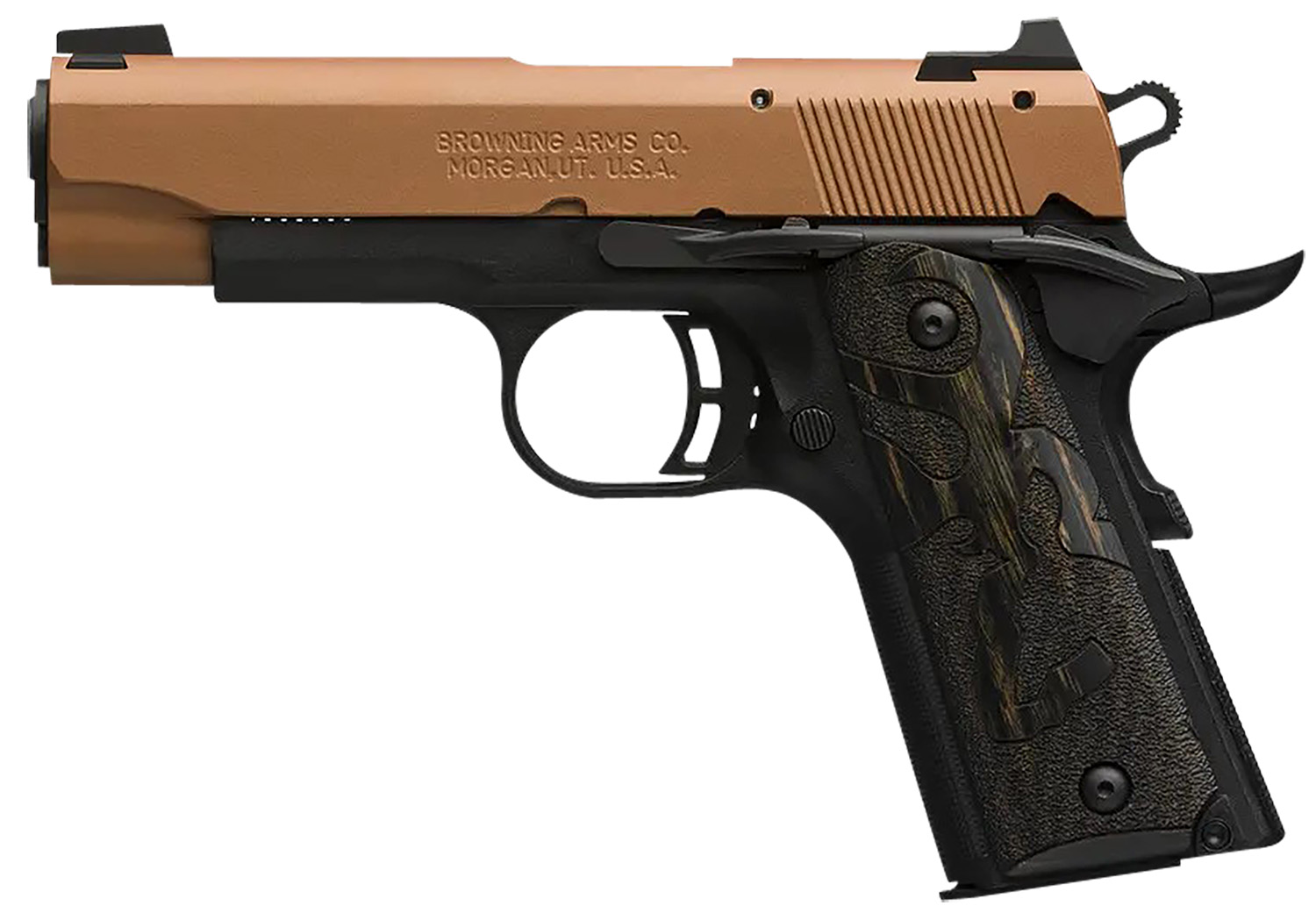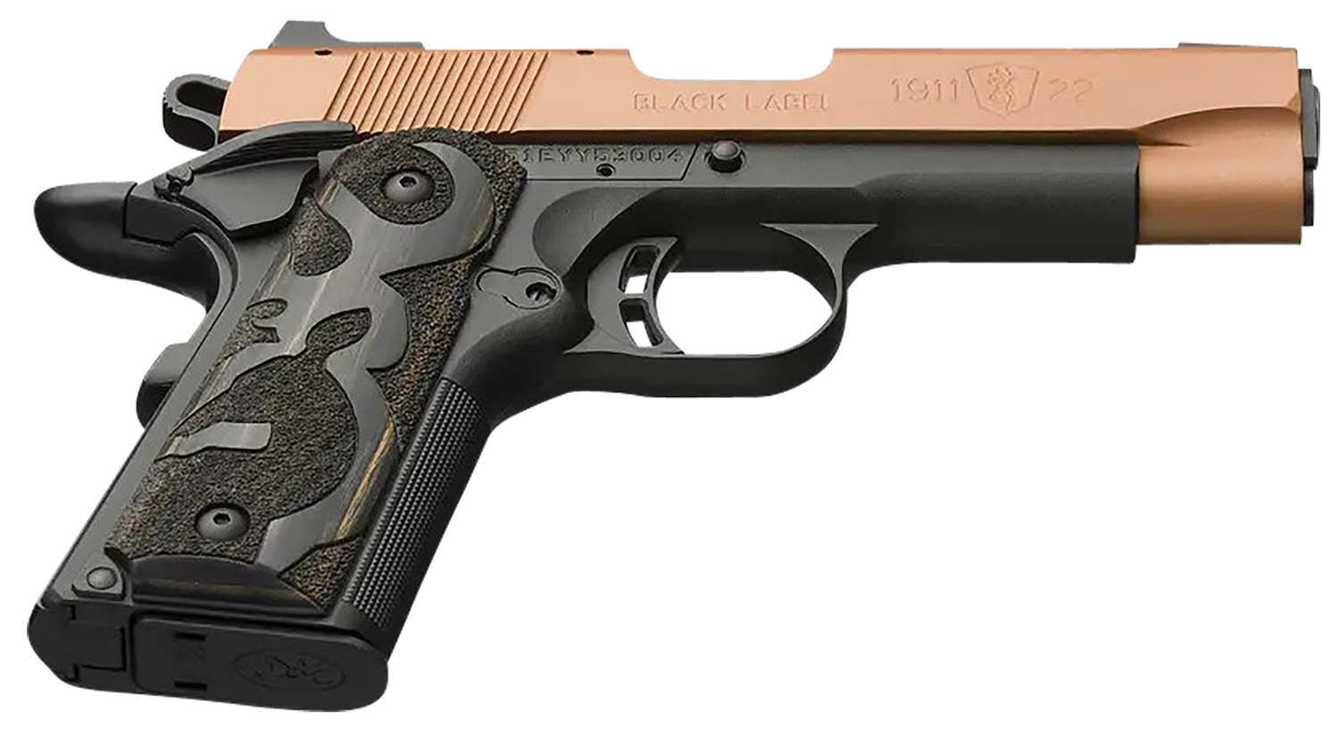 Browning 051896490 1911-22 Black Label Compact Frame 22 LR 10+1, 3.63″ Matte Stainless Steel Barrel, Copper Cerakote Serrated Slide, Matte Black Polymer Frame w/Beavertail, Black Laminate Wood Grip