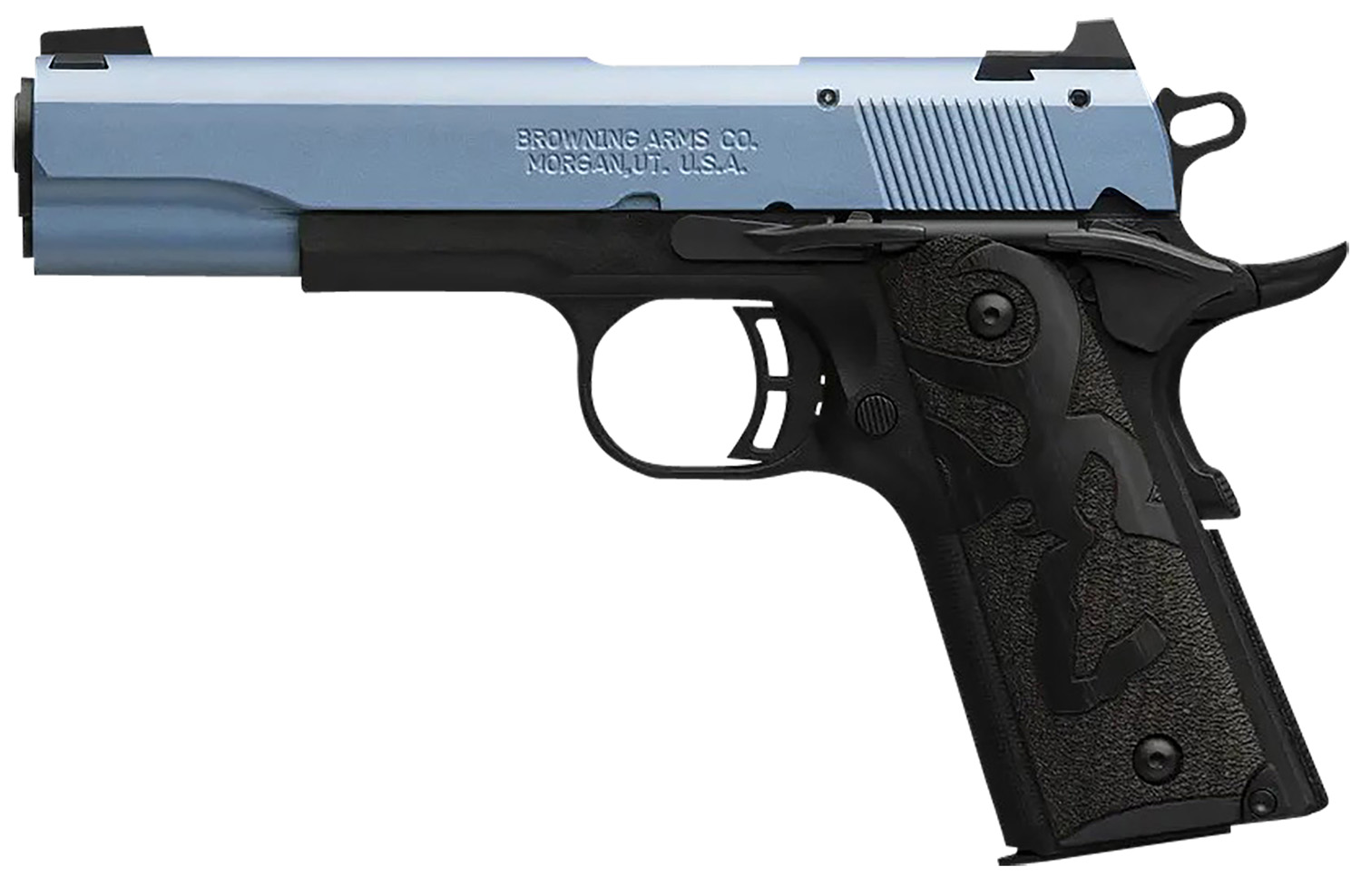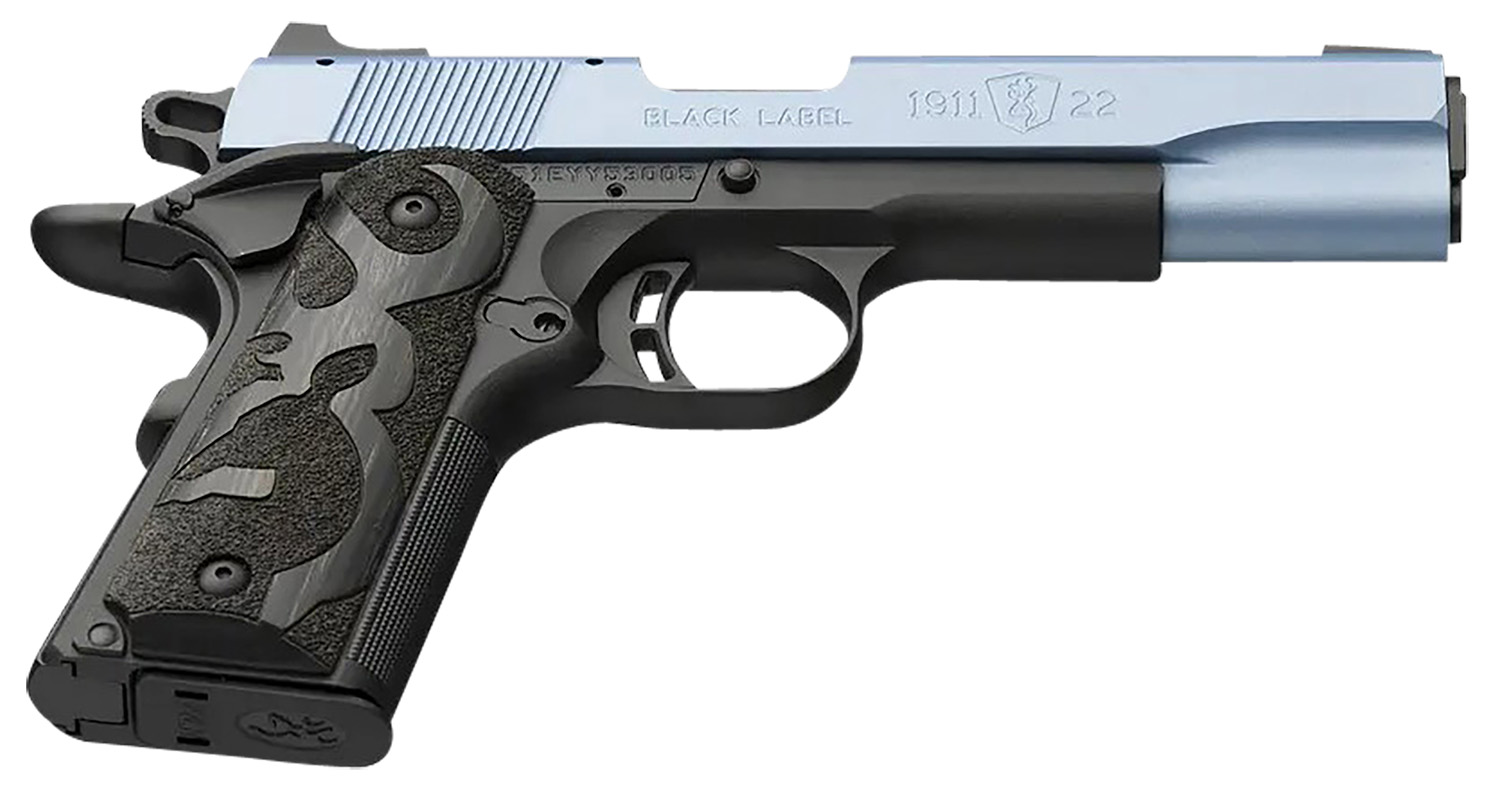Browning 051897490 1911 Black Label Full Size Frame 22 LR 10+1, 4.25″ Matte Stainless Steel Barrel, Polar Blue Cerakote Serrated Slide, Matte Black Polymer Frame w/Beavertail, Black Laminate Wood Grip
