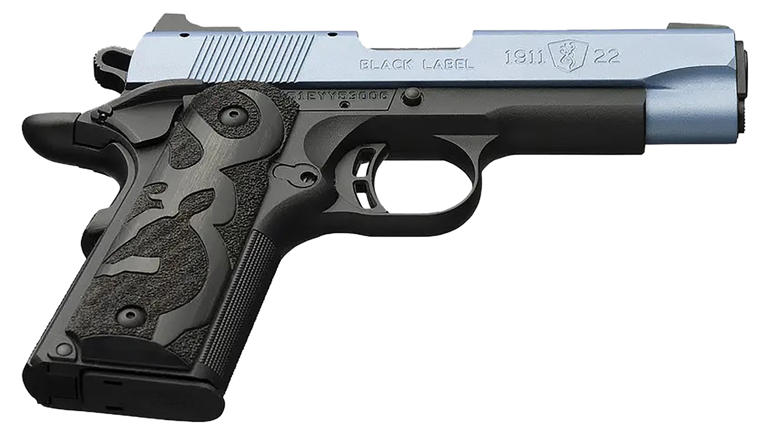 Browning 051898490 1911 Black Label Compact Frame 22 LR 10+1, 3.63″ Matte Stainless Steel Barrel, Polar Blue Cerakote Serrated Slide, Matte Black Polymer Frame w/Beavertail, Black Laminate Wood Grip