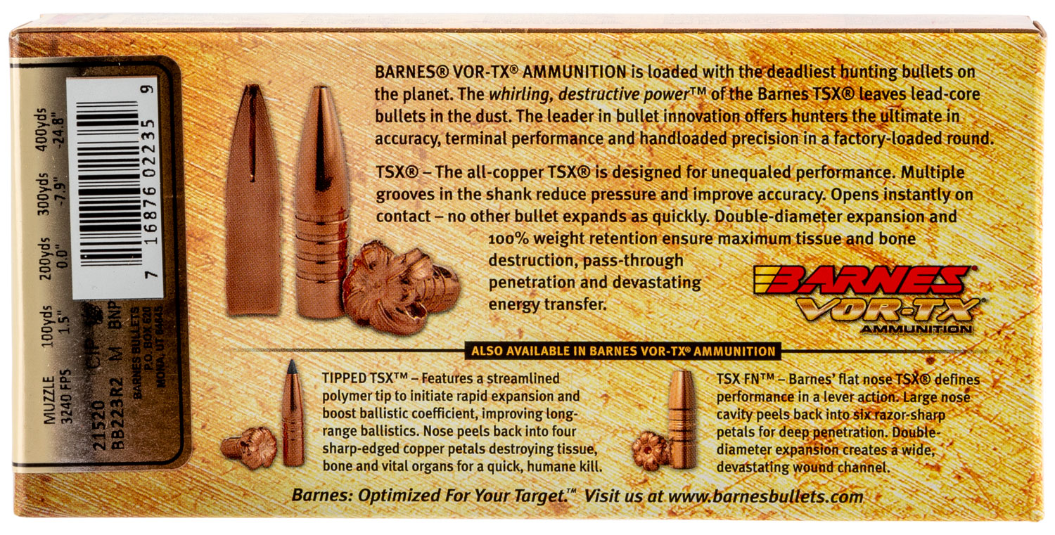Barnes Bullets 21520 VOR-TX Rifle 223Rem 55gr Barnes TSX Flat Base 20 Per Box/10 Case