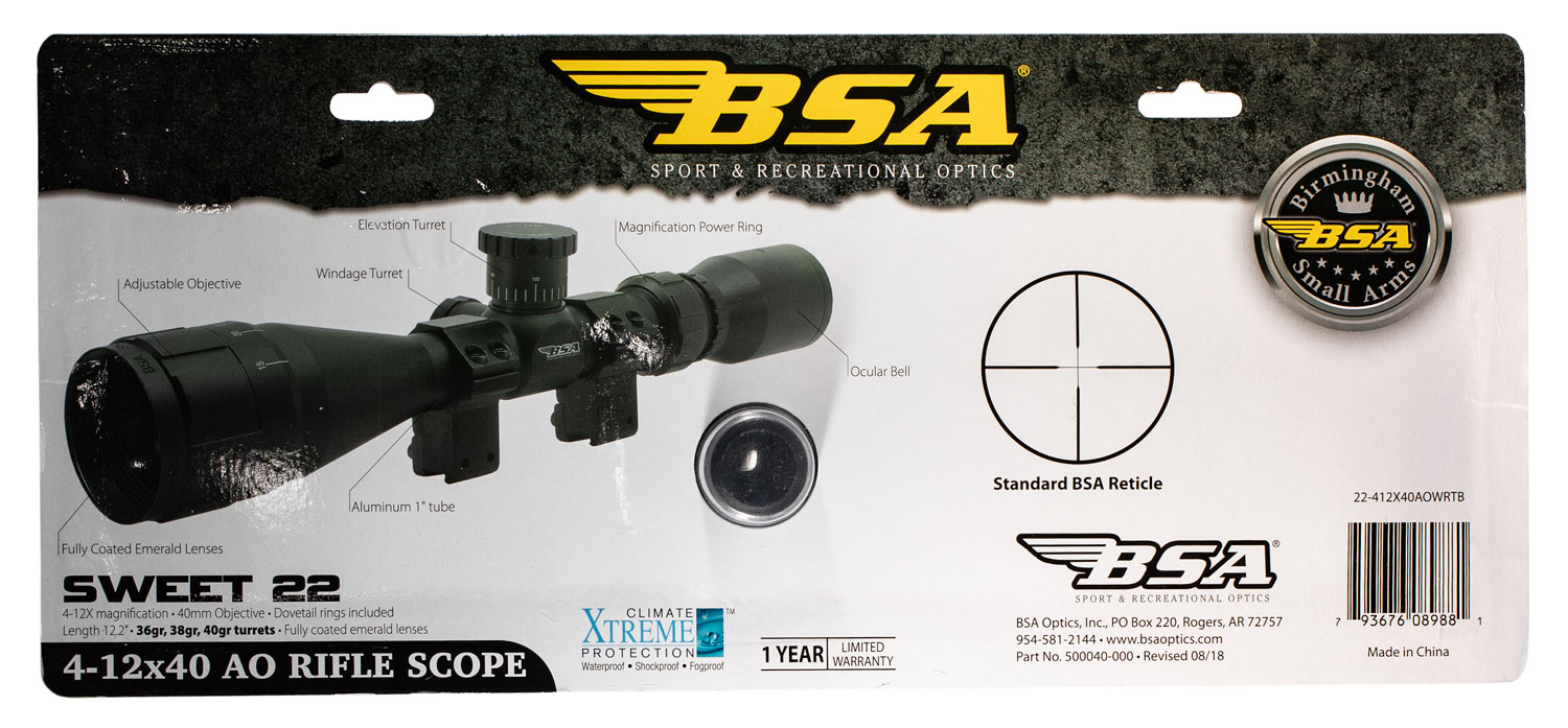 BSA 22412X40AO Sweet 22 Black Matte 4-12x 40mm AO 1″ Tube 30/30 Duplex Reticle