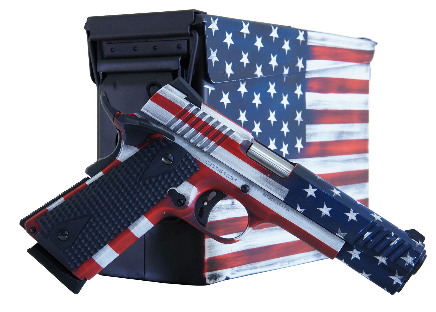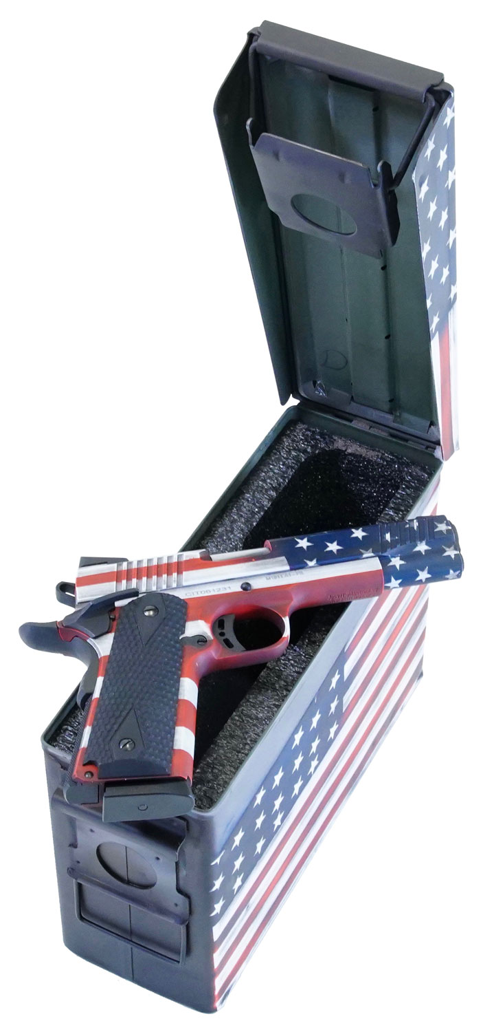 Citadel CITC45FUSAAC M1911 Flag 45 ACP 8+1, 5″ Stainless Steel Barrel, American Flag Cerakote Serrated Steel Slide, Steel Frame w/Beavertail, Features Matching Ammo Can, Ambidextrous