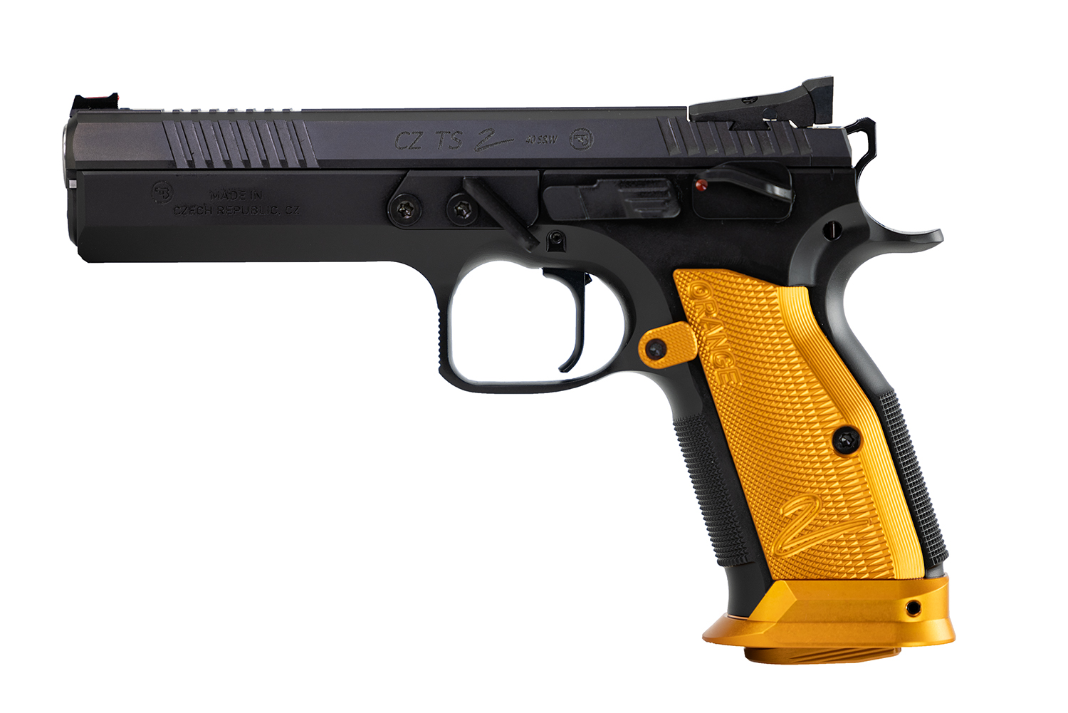 CZ-USA 91265 TS2 40 S&W 17+1 5.20″ Black Bull Barrel, Black Slide, Black Polycoat Frame, Orange Checkered Aluminum Grip