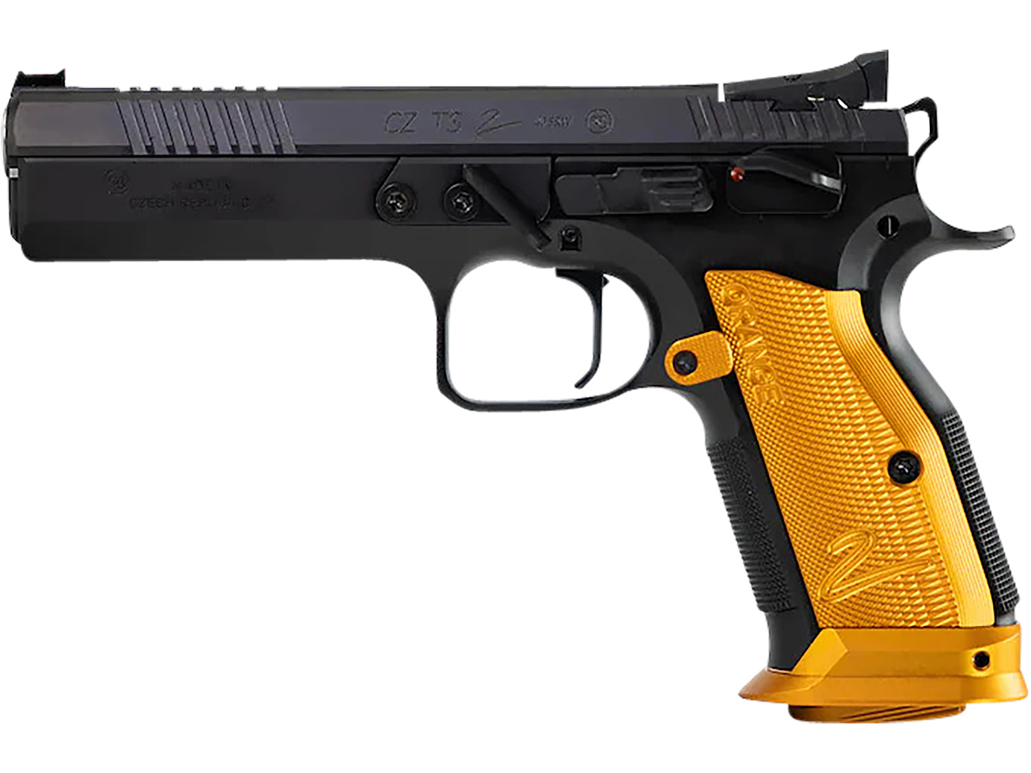 CZ-USA 91266 TS 2 9mm Luger 20+1 5.28″ Stainless Bull Barrel, Black Serrated Steel Slide, Black Polycoat Steel Frame w/Beavertail, Orange Checkered Aluminum Grip