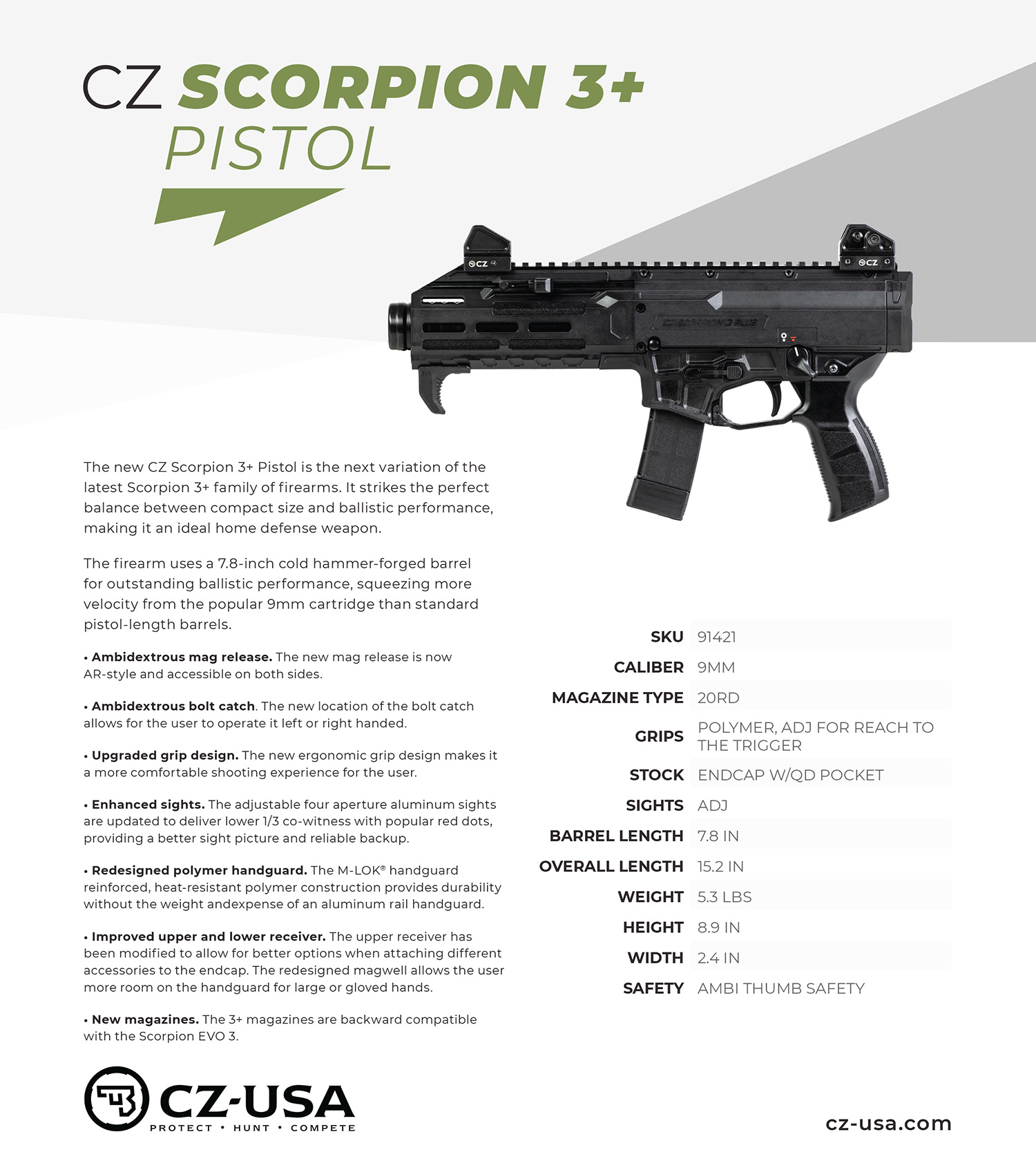 CZ-USA 91421 Scorpion 3+ 9mm Luger 20+1 7.80″ Cold Hammer Forged Threaded Barrel, Fiber-Reinforced Polymer Frame, Double Stack Polymer Magazine, Ambidextrous Thumb Safety