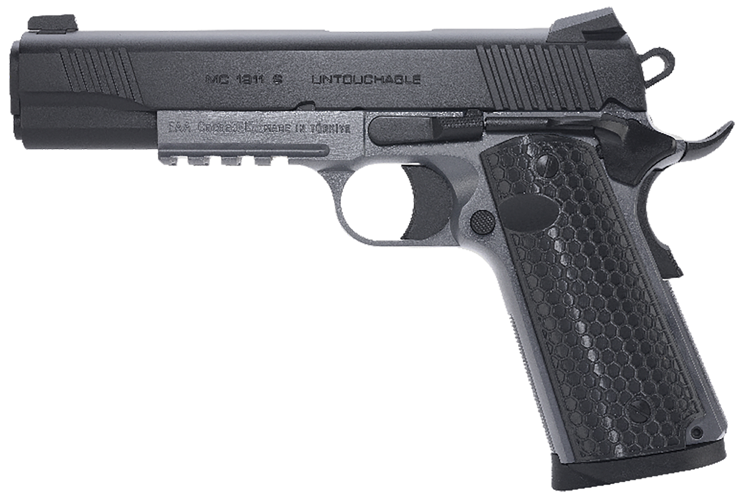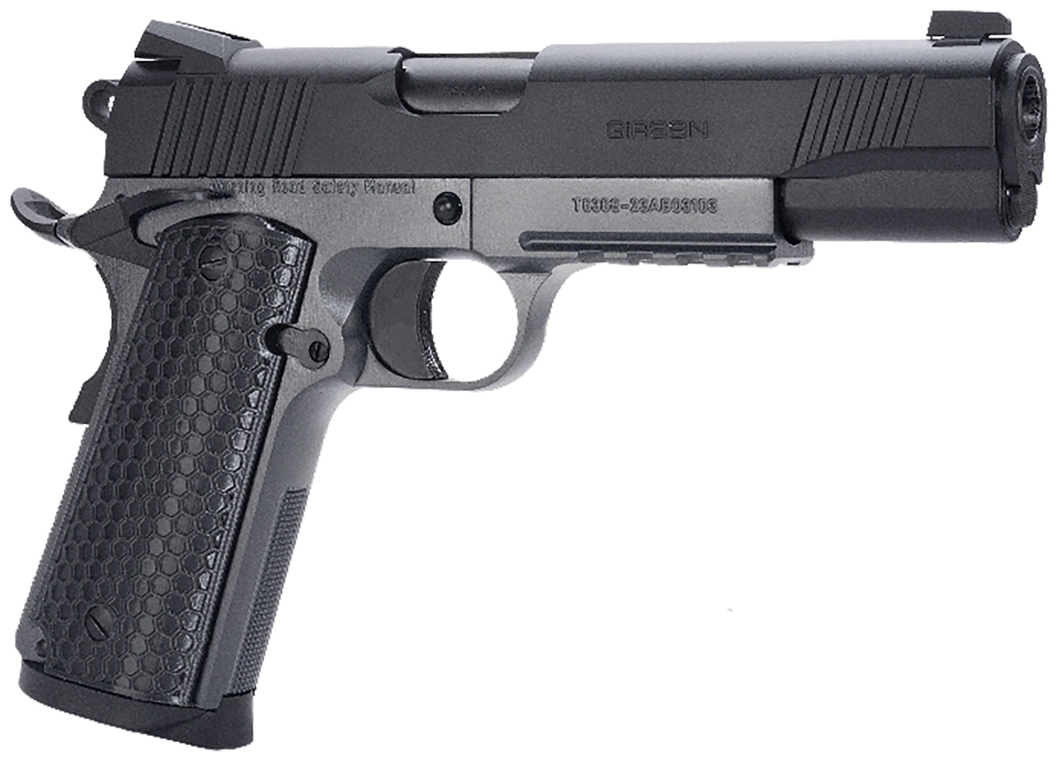 Girsan 392062 MC1911 S Untouchable Full Size 45 ACP 8+1 5″ Black Steel Barrel, Black Serrated Steel Slide, Stainless Frame w/Beavertail & Picatinny Rail, Black Polymer Grip