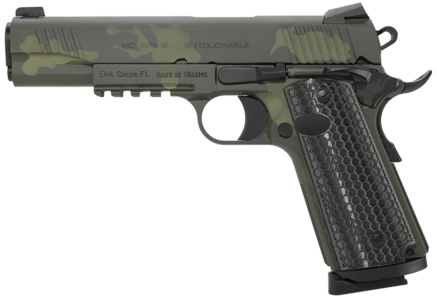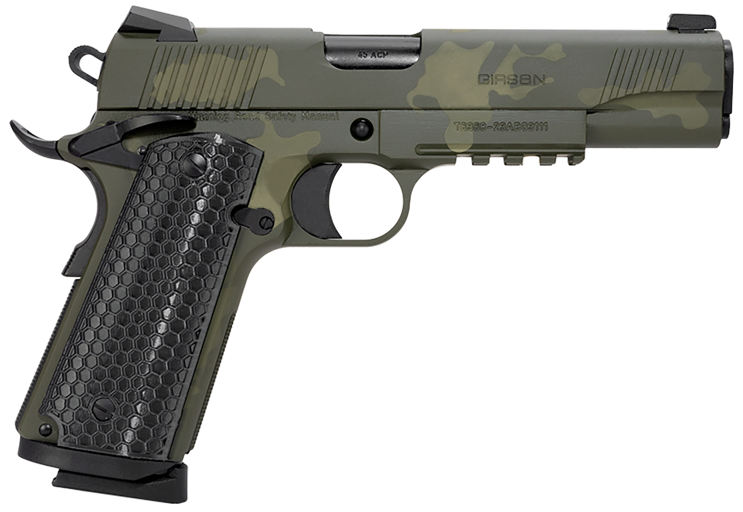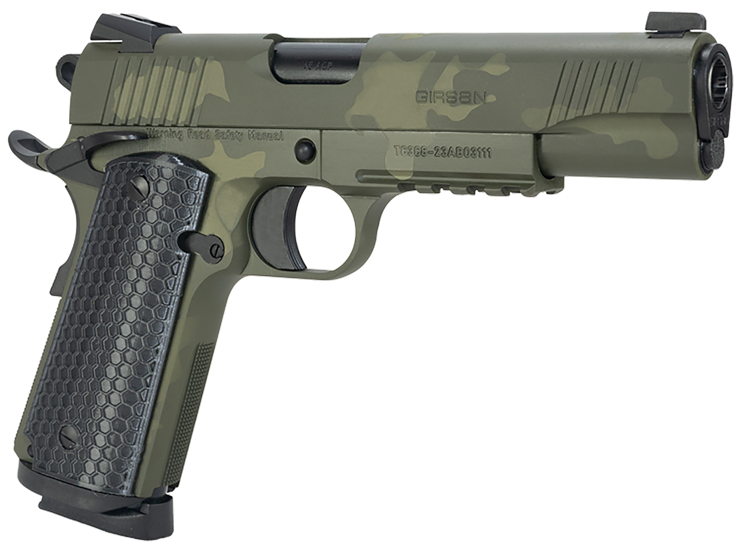 Girsan 392074 MC1911 S Untouchable Full Size 45 ACP 8+1 5″ Black Steel Barrel, OD Camo Serrated Steel Slide & Frame w/Beavertail & Picatinny Rail, Black Polymer Grip