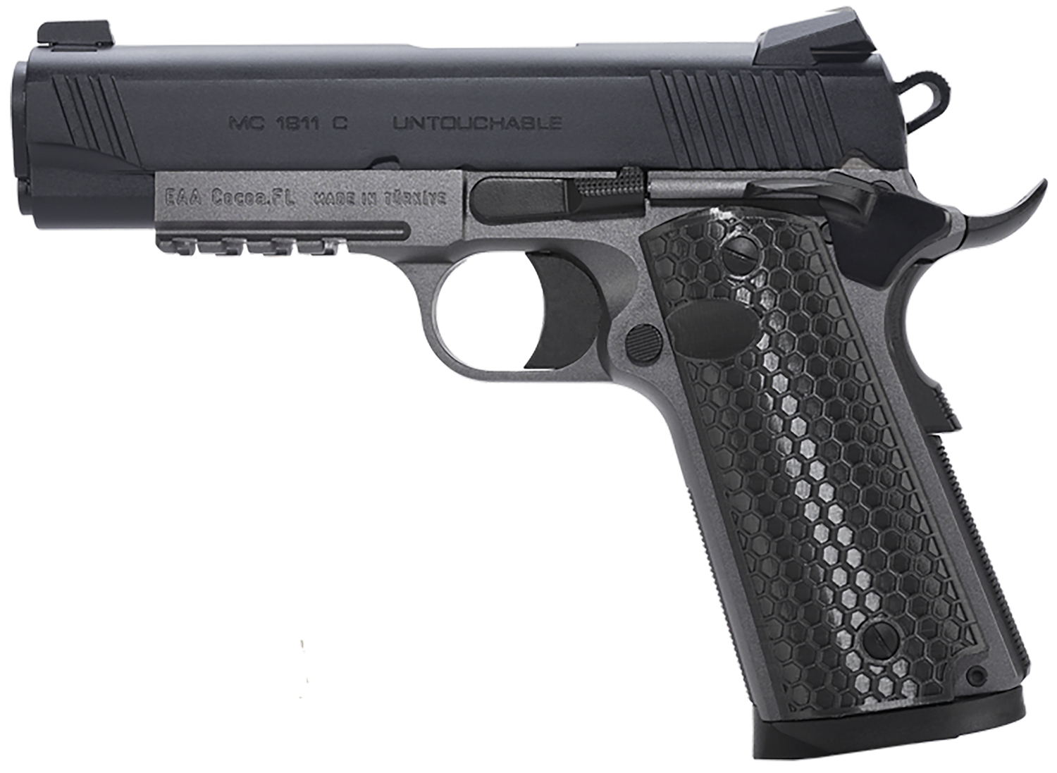 EAA GIRSAN 392077 MC1911 C Untouchable Compact Frame 9mm Luger 9+1 4.40″ Black Steel Barrel, Black Serrated Steel Slide, Stainless Steel Frame w/Beavertail & Picatinny Rail, Black Polymer Grip