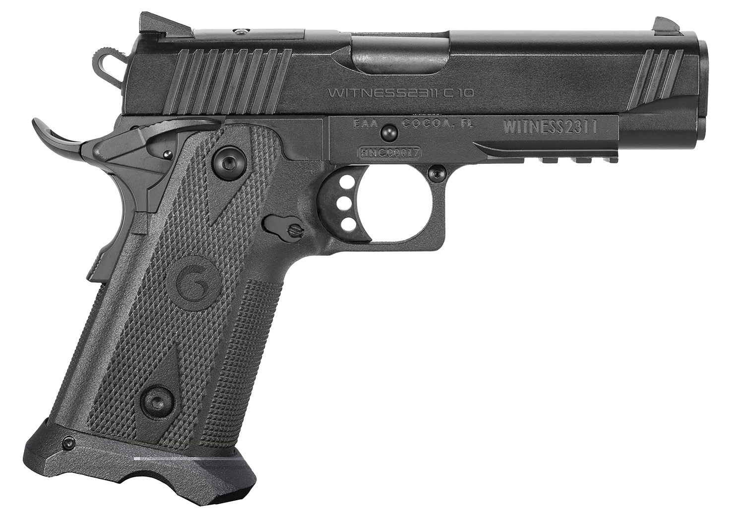 Girsan 395010 Witness2311 10mm Auto 15+1 4.25″ Black Steel Barrel, Black Serrated Black Polymer Frame w/Beavertail & Picatinny Rail, Black Checkered Polymer Grip, Ambidextrous