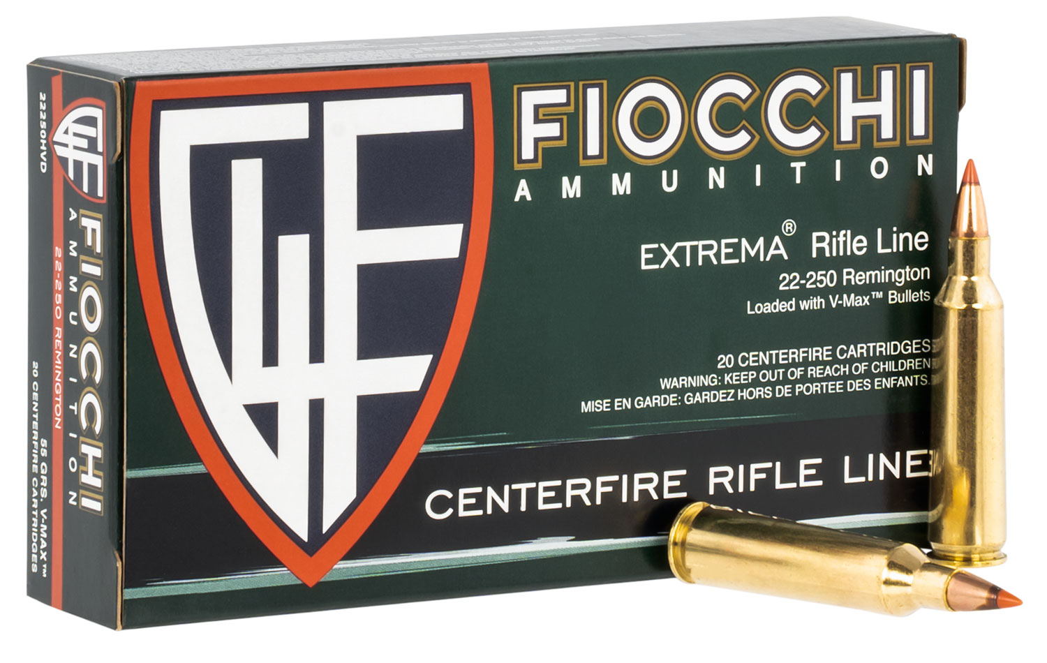 Fiocchi 22250HVD Field Dynamics 22-250Rem 55gr Hornady V Max 20 Per Box/10 Case