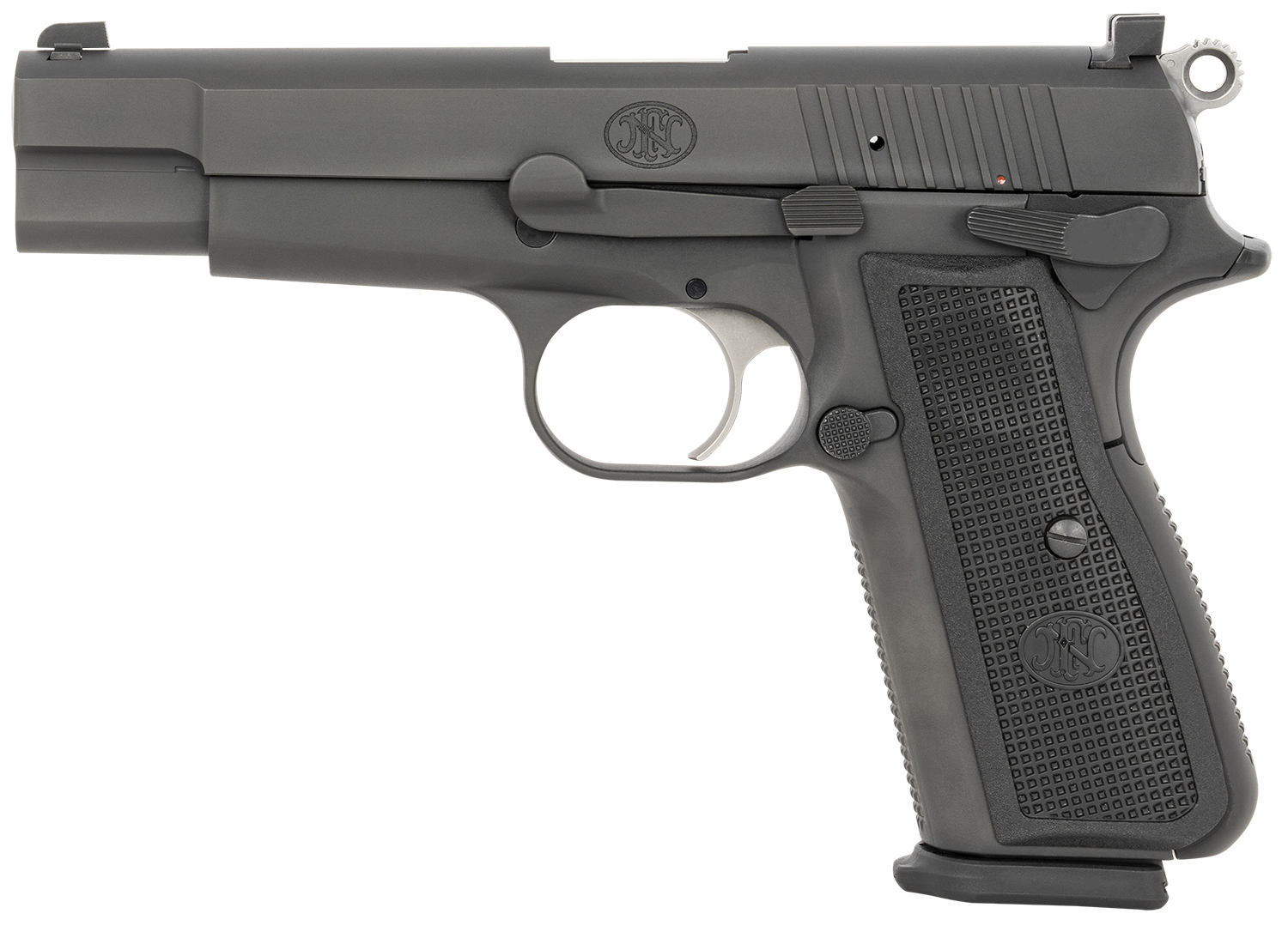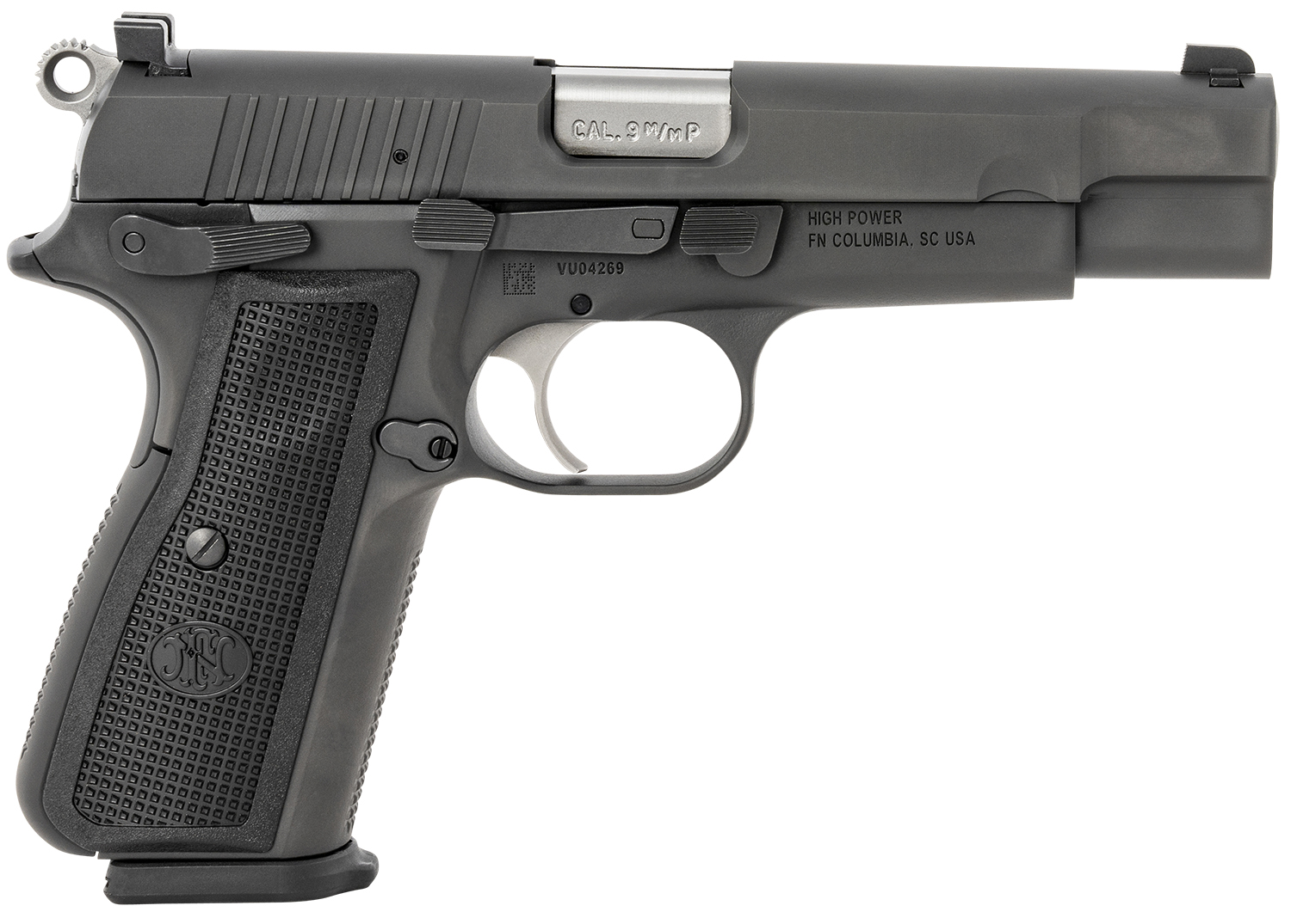 FN 66100256 High Power 9mm Luger 17+1, 4.70″ Black Target Crown Steel Barrel, Black PVD Serrated Steel Slide & Steel Frame w/Beavertail, Black Textured Polymer Grip, Ambidextrous