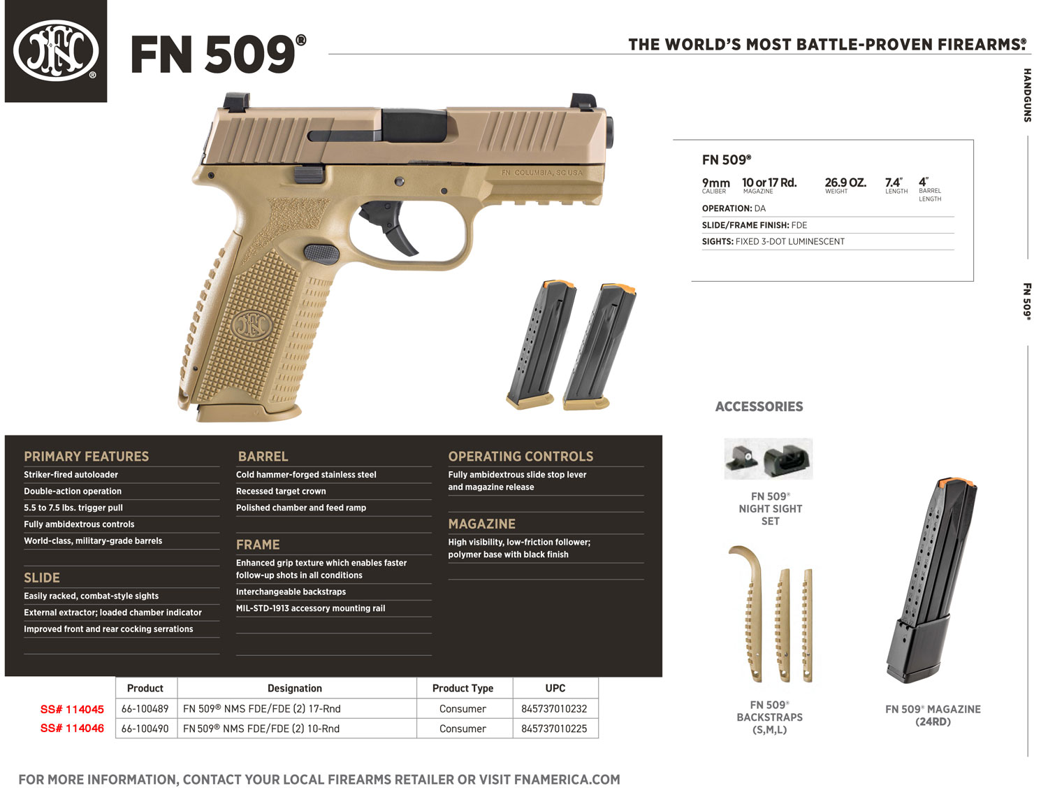 FN 66100490 509 9mm Luger 10+1 4″ Black Target Crown Steel Barrel, Flat Dark Earth Serrated Stainless Steel Slide & Polymer Frame w/Picatinny Rail, FDE Interchangeable Backstrap Grip, Ambidextrous