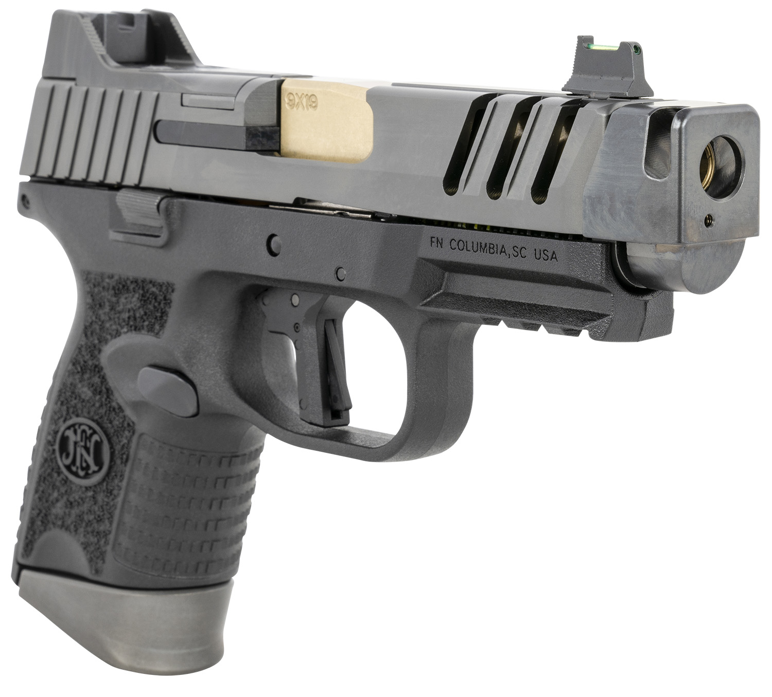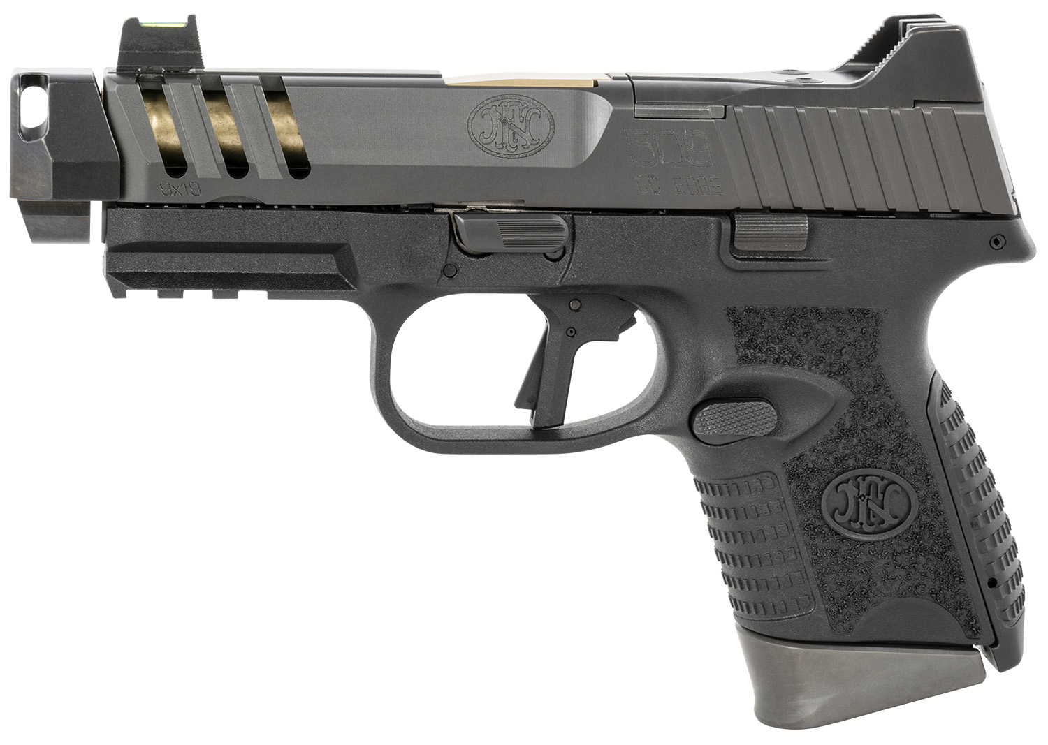 FN 66101350 509 CC Edge 9mm Luger 10+1 (3) 4.20″ Threaded Gold Barrel, Black Frame, Graphite Optic & Lightening Cut Slide, Optic Height Fiber Optic Sights, Compensator (No Manual)