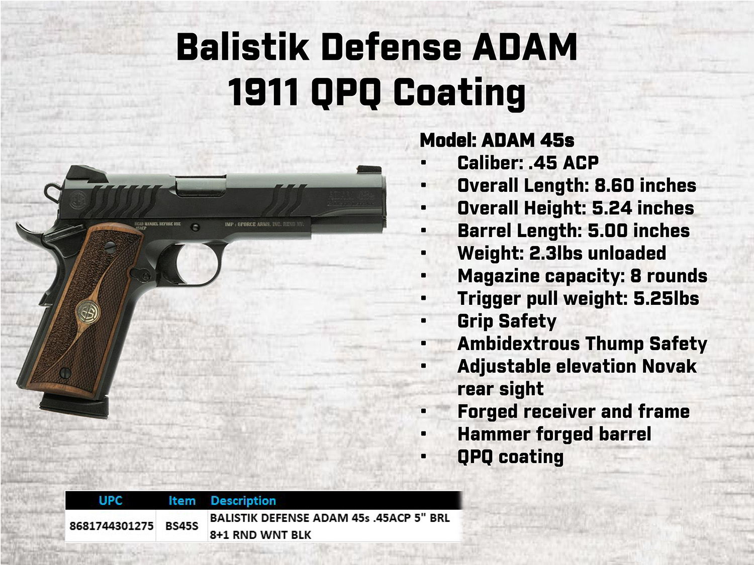 Gforce Arms BS45S Balistik Defense Adam 1911 Full Size Frame 45 ACP 8+1 5″ Black Steel Barrel, Black Cerakote Serrated Steel Slide, Black Cerakote Steel Frame w/Beavertail, Walnut Grip