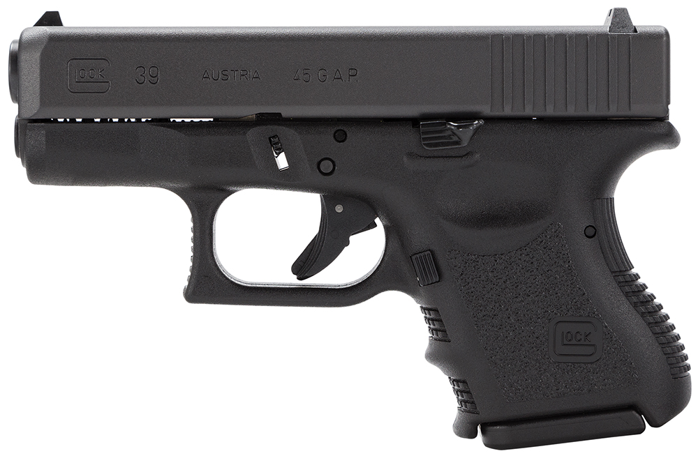 Glock PI3950201 G39 Gen3 Sub-Compact 45 GAP 6+1 3.43″ Black Polygonal Rifled Barrel, Matte Black Serrated Slide, Black Polymer Frame, Black Textured Finger Grooved Polymer Grip, Right Hand
