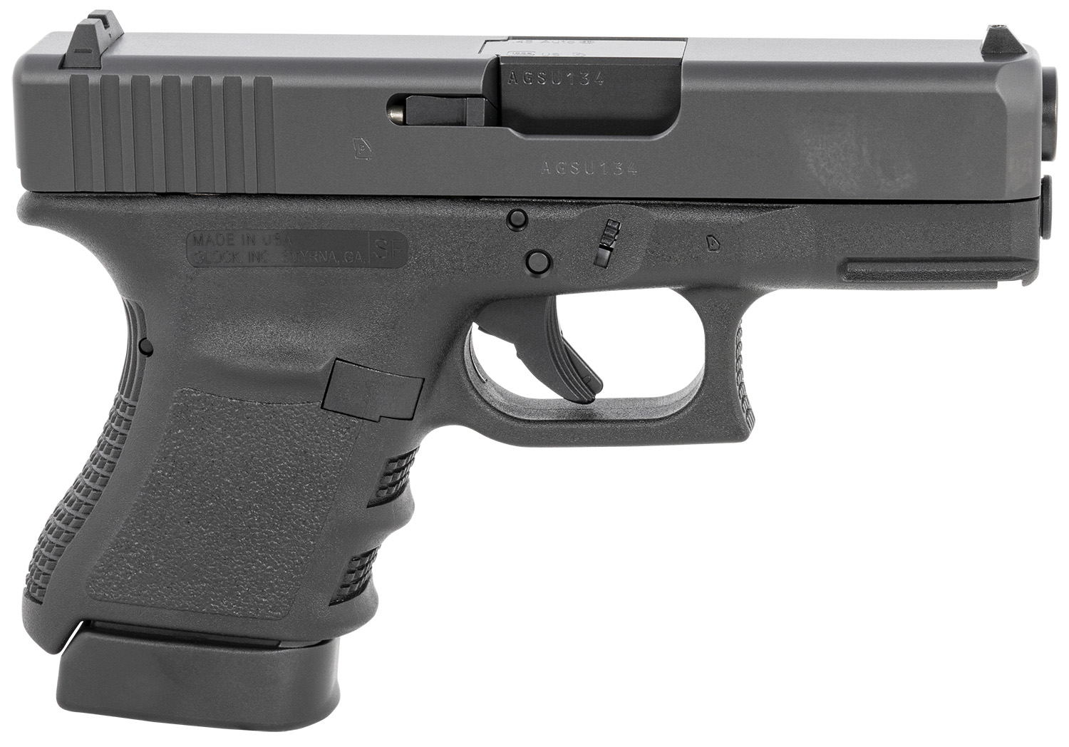 Glock UF3050201 G30 SF Gen3 Sub-Compact 45 ACP 10+1 3.78″ Black Steel Barrel, Matte Black Serrated Slide, Black Polymer Frame w/Picatinny Rail, Black Textured Finger Grooved Polymer Grip, Right Hand