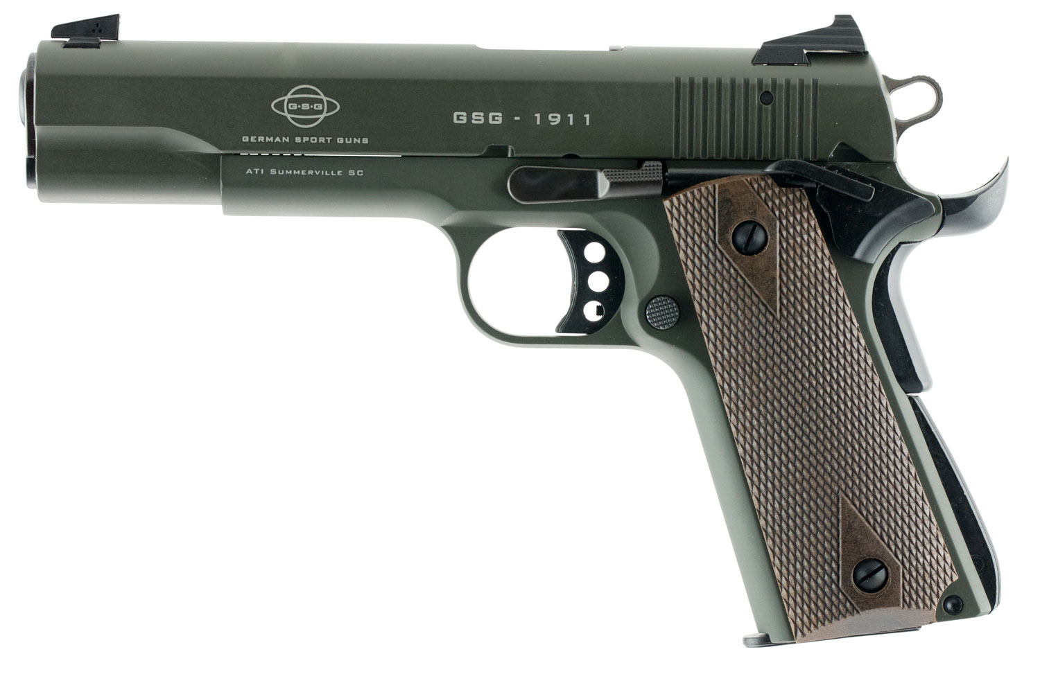 GSG GSG2210M1911G 1911 22 LR 10+1 5″ Threaded Barrel, OD Green Serrated Slide, OD Green Zinc Alloy w/Beavertail Frame, Double Diamond Walnut Grip
