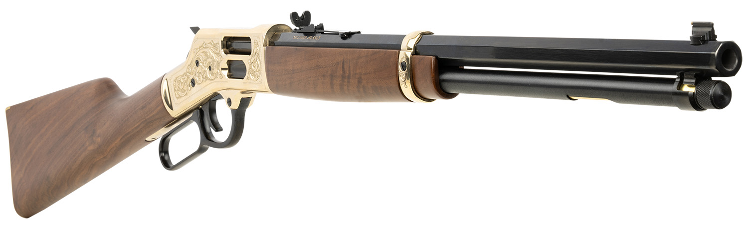 Henry H006GCD Deluxe Side Gate Deluxe Full Size 45 Colt (LC) 10+1, 20″ Blued Octagon Barrel, Polished Brass Engraved Drilled & Tapped Receiver, American Walnut Fixed Wood Stock, Ambidextrous