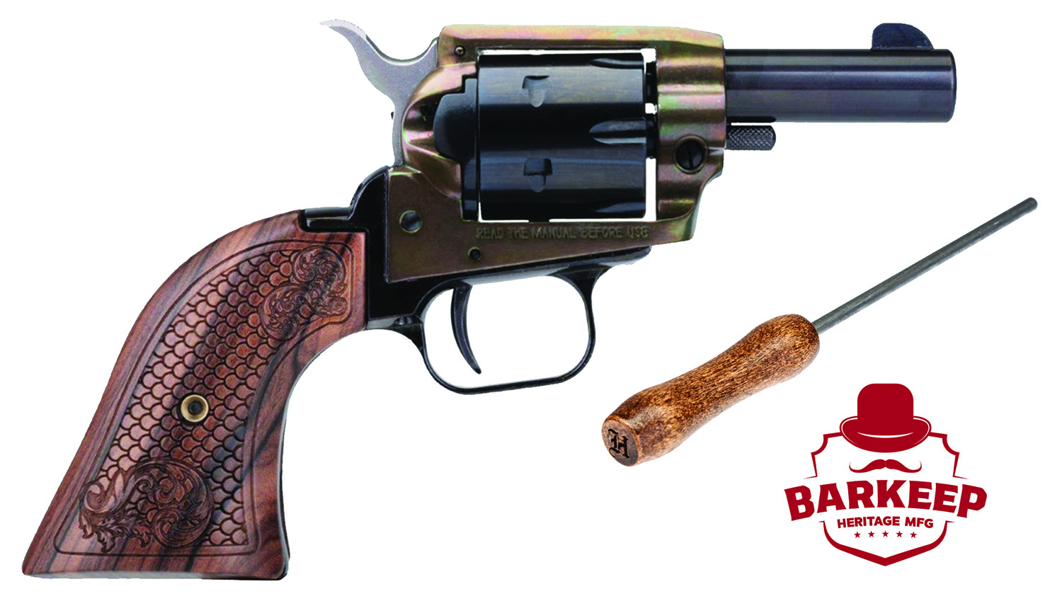 Heritage Mfg BK22CH2WBRN10 Barkeep 22 LR 6 Shot, 2.67″ Black Oxide Steel Barrel, Simulated Case Hardened Zinc Alloy Frame, Black Oxide Cylinder, Custom Scroll Wood Grip, Manual Safety, Exposed Hammer
