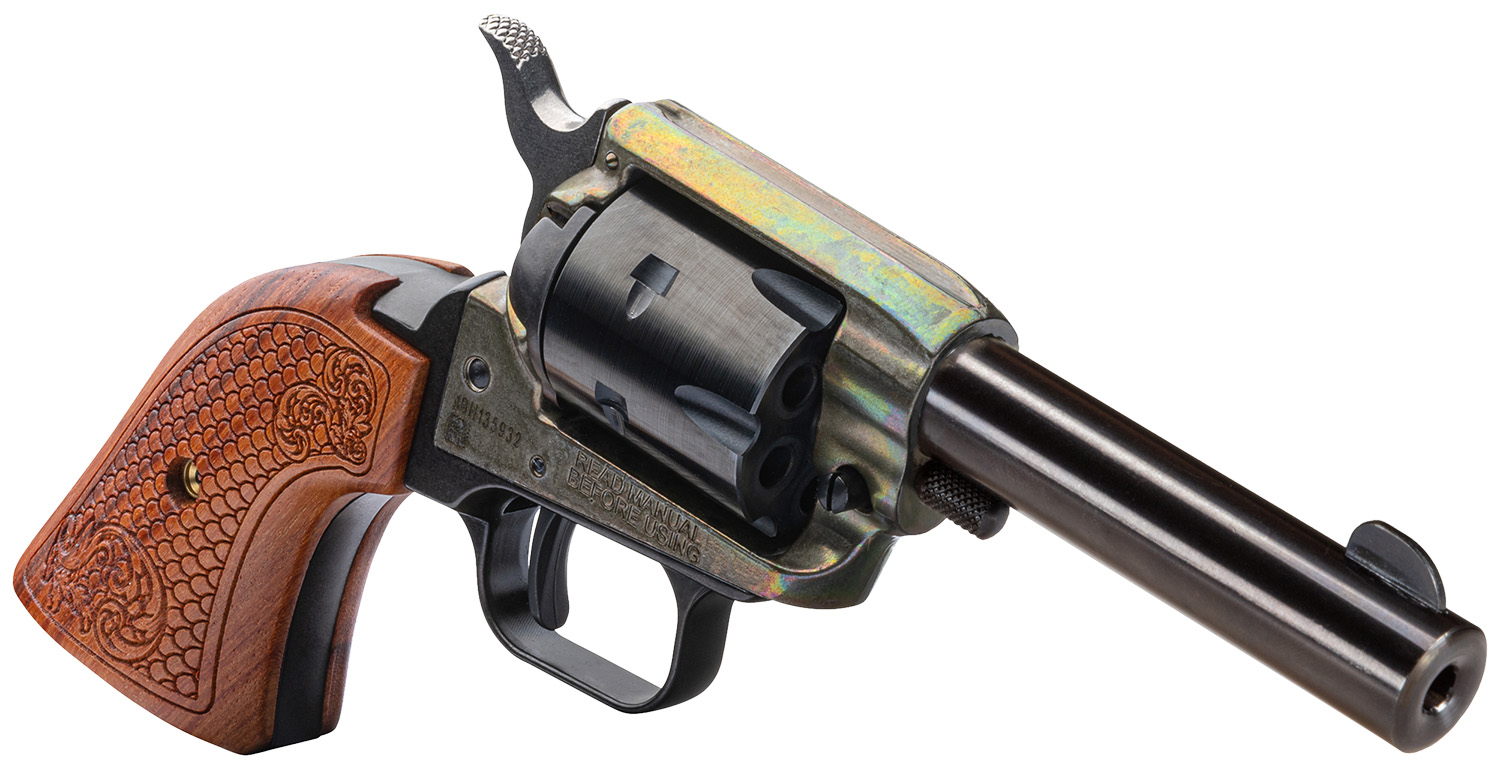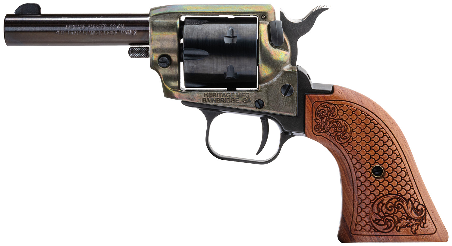 Heritage Mfg BK22CH3WBRN10 Barkeep 22 LR 6 Shot, 3″ Black Oxide Steel Barrel, Simulated Case Hardened Zinc Alloy Frame, Black Oxide Cylinder, Custom Scroll Wood Grip, Manual Safety, Exposed Hammer