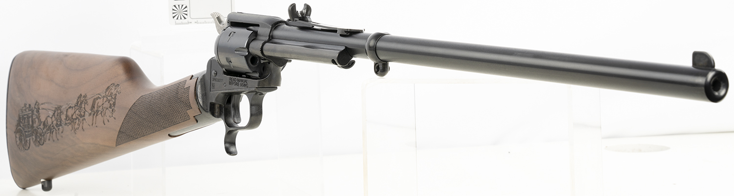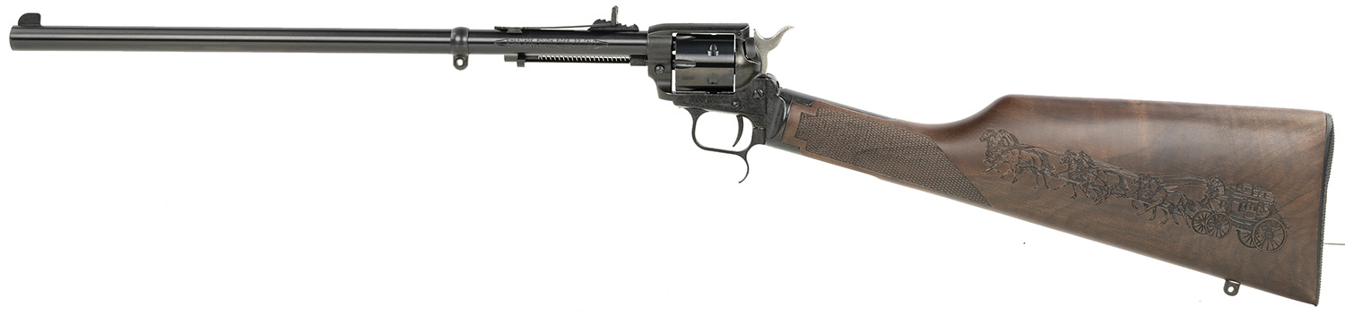 Heritage Mfg BR226B16HSWB01 Rough Rider Rancher 22 LR 6rd 16″ Barrel, Black Metal Finish, Exposed Hammer, Walnut Stagecoach Engraved Stock