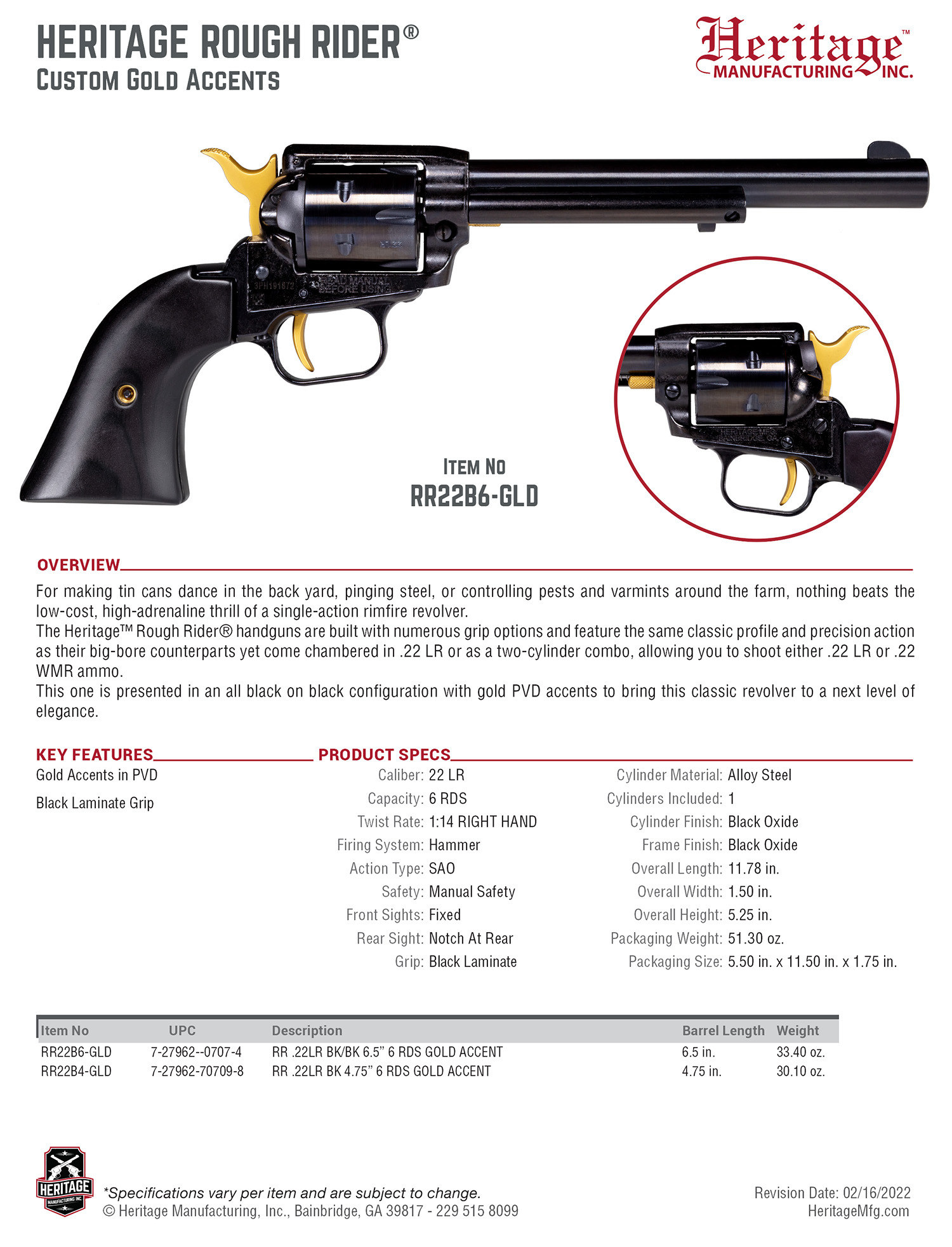 Heritage Mfg RR22B4GLD Rough Rider 22 LR 6 Shot 4.75″ Black Oxide Barrel, Cylinder & Frame, Black Laminate Wood Grips Features Gold Accents