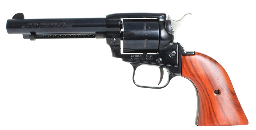 Heritage Mfg RR22B4 Rough Rider 22 LR 6 Shot, 4.75″ Black Steel Barrel, Black Zinc Alloy Frame, Black Cylinder Cocobolo Grip, Hammer/Thumb Safety, Exposed Hammer