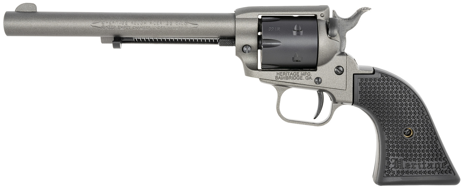 Heritage Mfg RR22C6 Rough Rider 22 LR 6 Shot. 6.50″ Tungsten Gray Cerakote Steel Barrel & Frame, Black Satin Cylinder, Black Star Polymer Grip, Hammer/Thumb Safety, Exposed Hammer