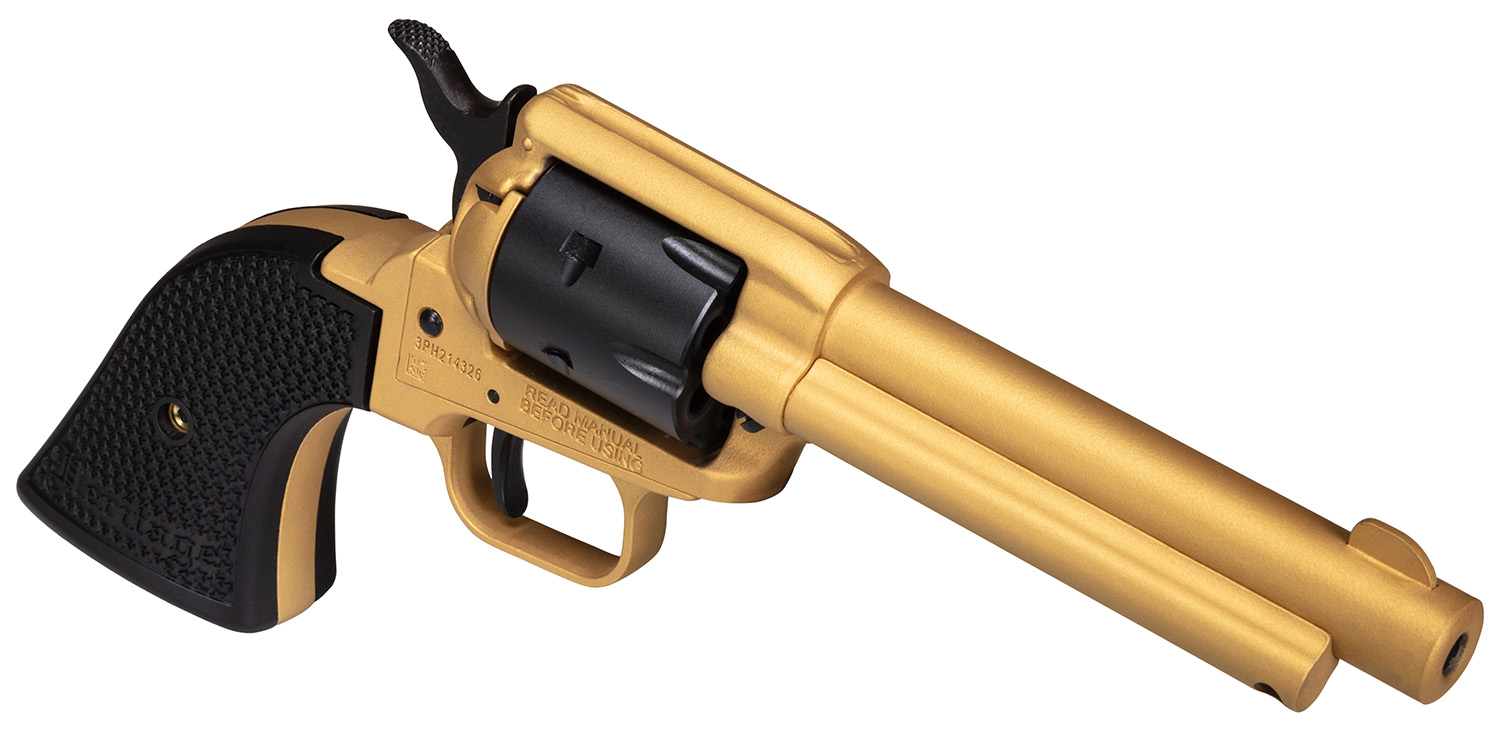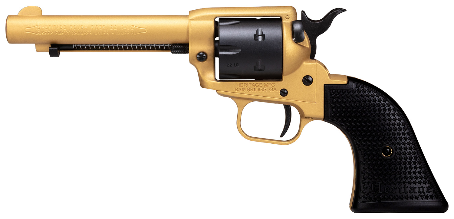 Heritage Mfg RR22S4 Rough Rider 22 LR 6 Shot 4.75″ Gold Cerakote Steel Barrel & Frame, Black Satin Cylinder, Black Polymer Grips Features Black Accents