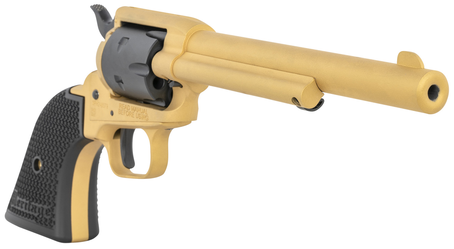 Heritage Mfg RR22S6 Rough Rider 22 LR 6 6.50″, Gold Cerakote Barrel, Black Satin Cylinder, Gold Cerakote Steel Frame, Black Polymer Grips Features Black Accents