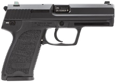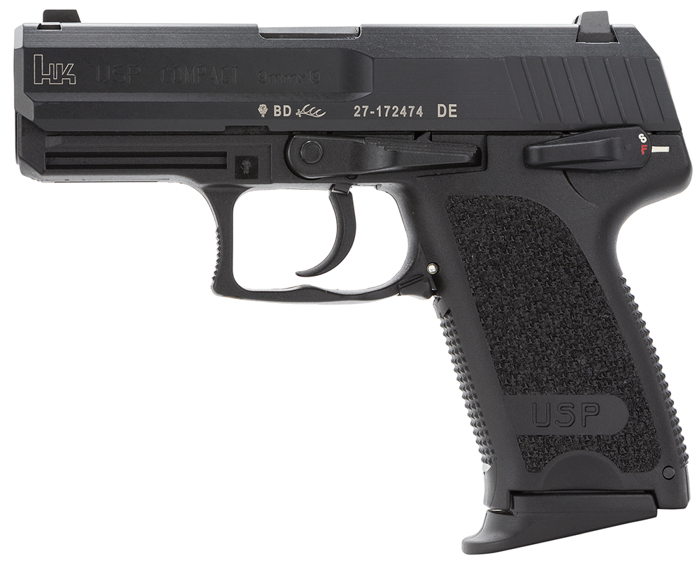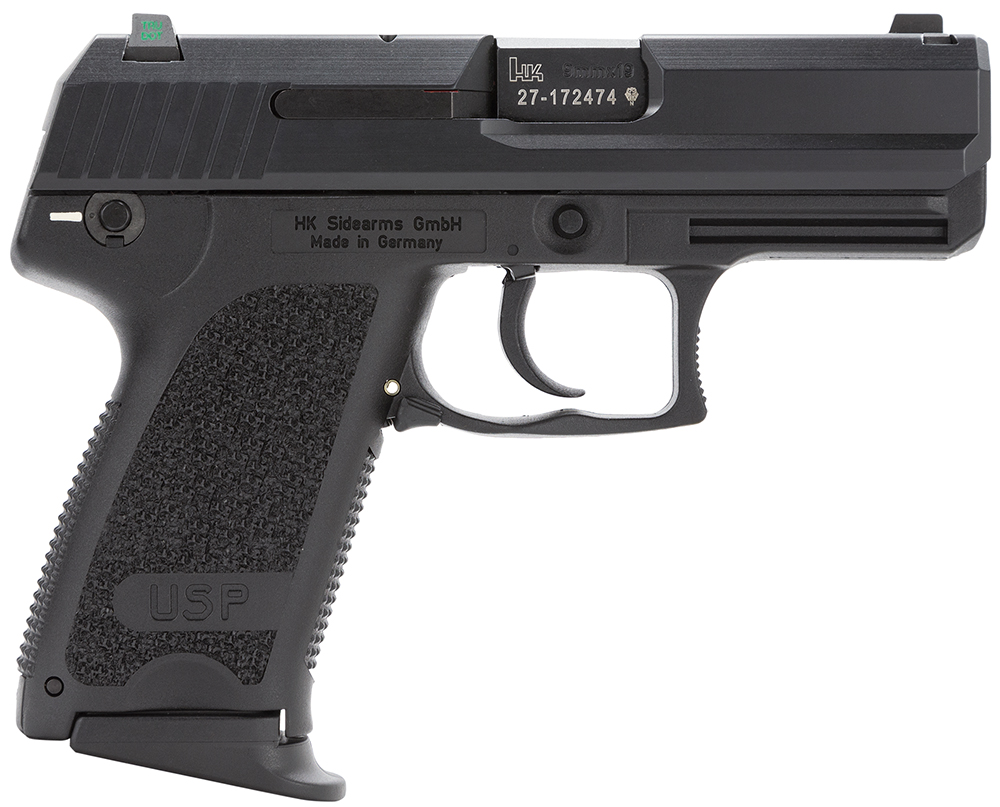 HK 81000330 USP Compact Frame 9mm Luger 13+1, 3.58″ Black Polygonal Rifled Barrel, Black Serrated Steel Slide, Black Polymer Frame, Black Polymer Grip, Night Sights, Bobbed Hammer, Ambidextrous