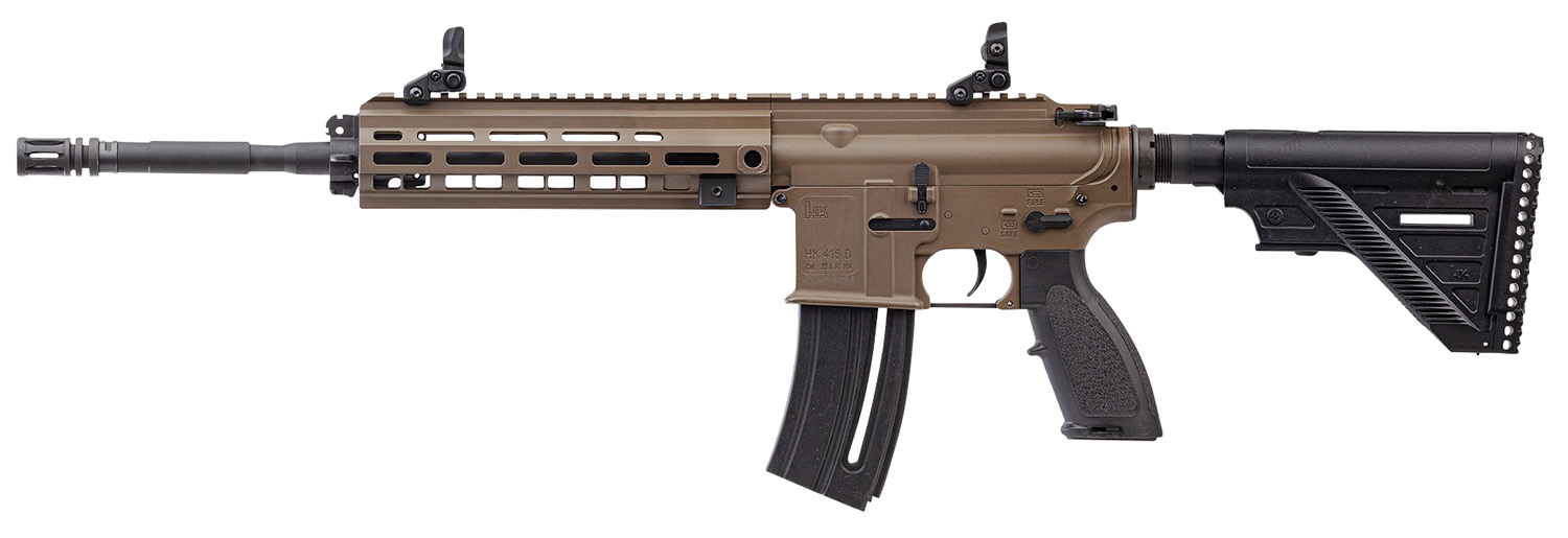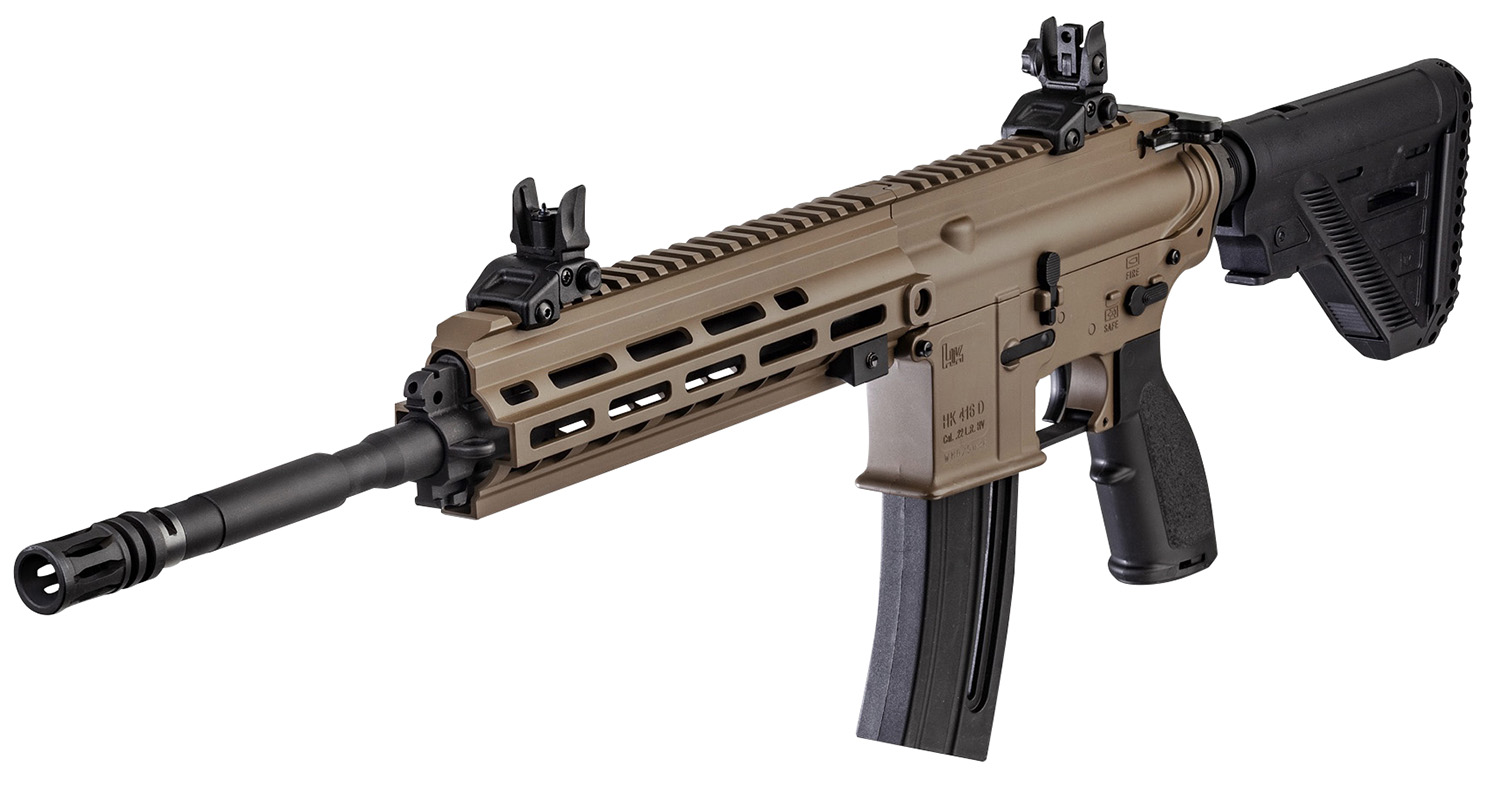 HK 81000528 HK 416 Exclusive Color 22 LR 20+1 16.10″ Black Steel Threaded Barrel Aluminum w/M-LOK & Picatinny Rail Flat Dark Earth Aluminum Receiver Black Retractable Stock Right Hand