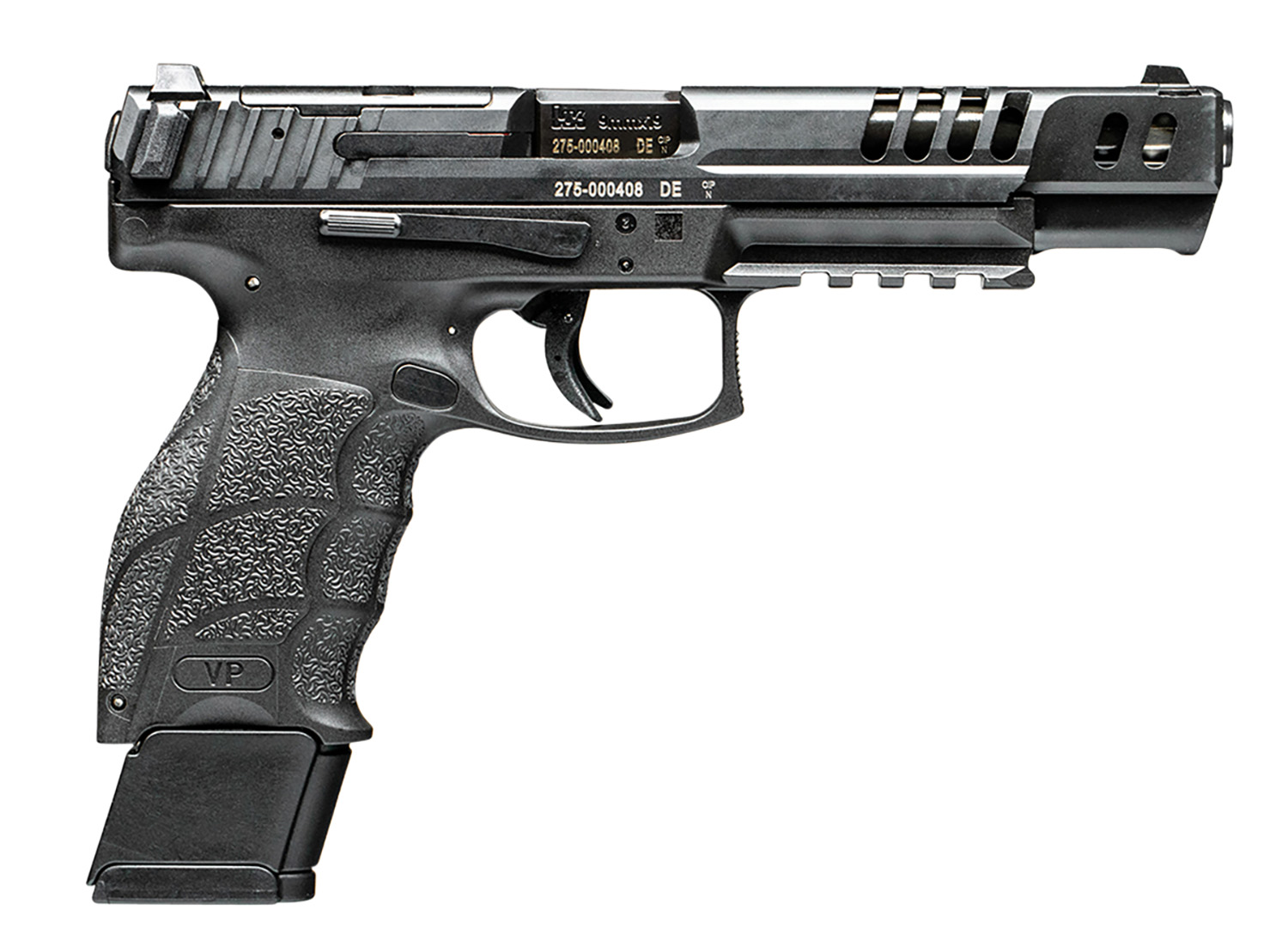 HK 81000553 VP9 Match 9mm Luger 20+1 5.51″ Polygonal Rifled Barrel, Black Optic Ready/Serrated w/Ports Slide & Frame w/Picatinny Rail, Black Finger Grooved Polymer Grips Ambidextrous
