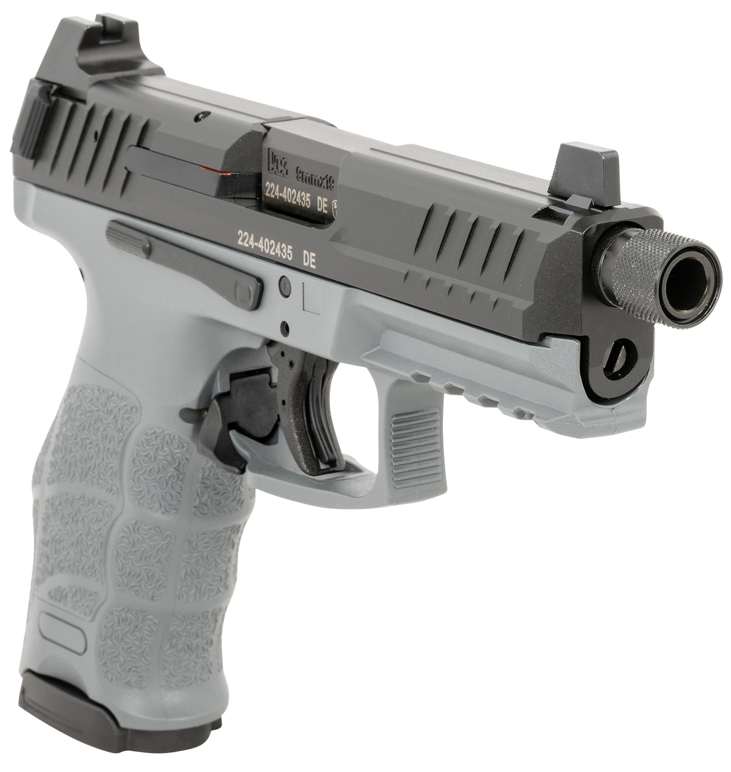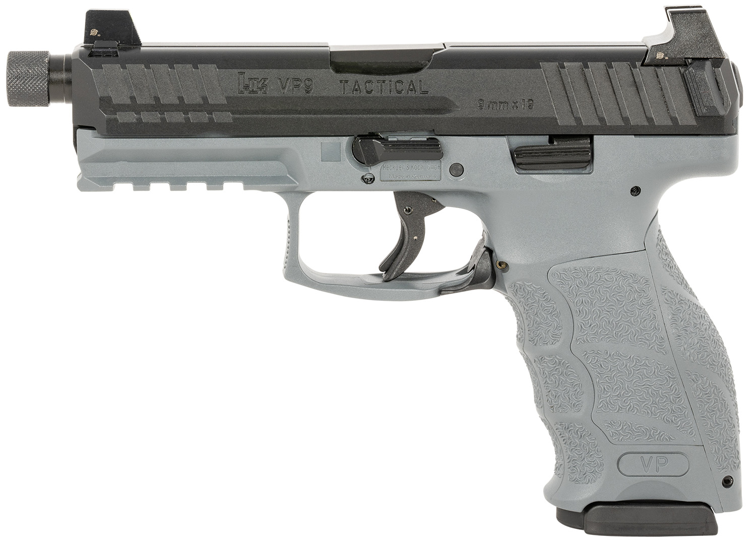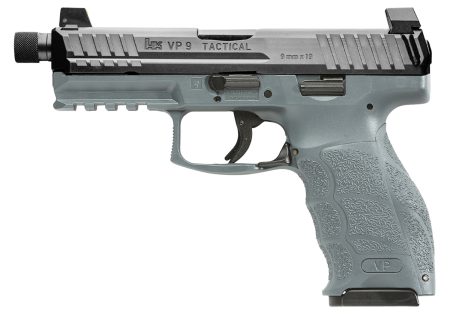 HK 81000787 VP Tactical 9mm Luger 10+1 4.70″ Steel Threaded Barrel Black Serrated Slide Gray Polymer Frame w/Picatinny Rail Gray Finger Grooved Interchangeable Backstrap Grips Right Hand