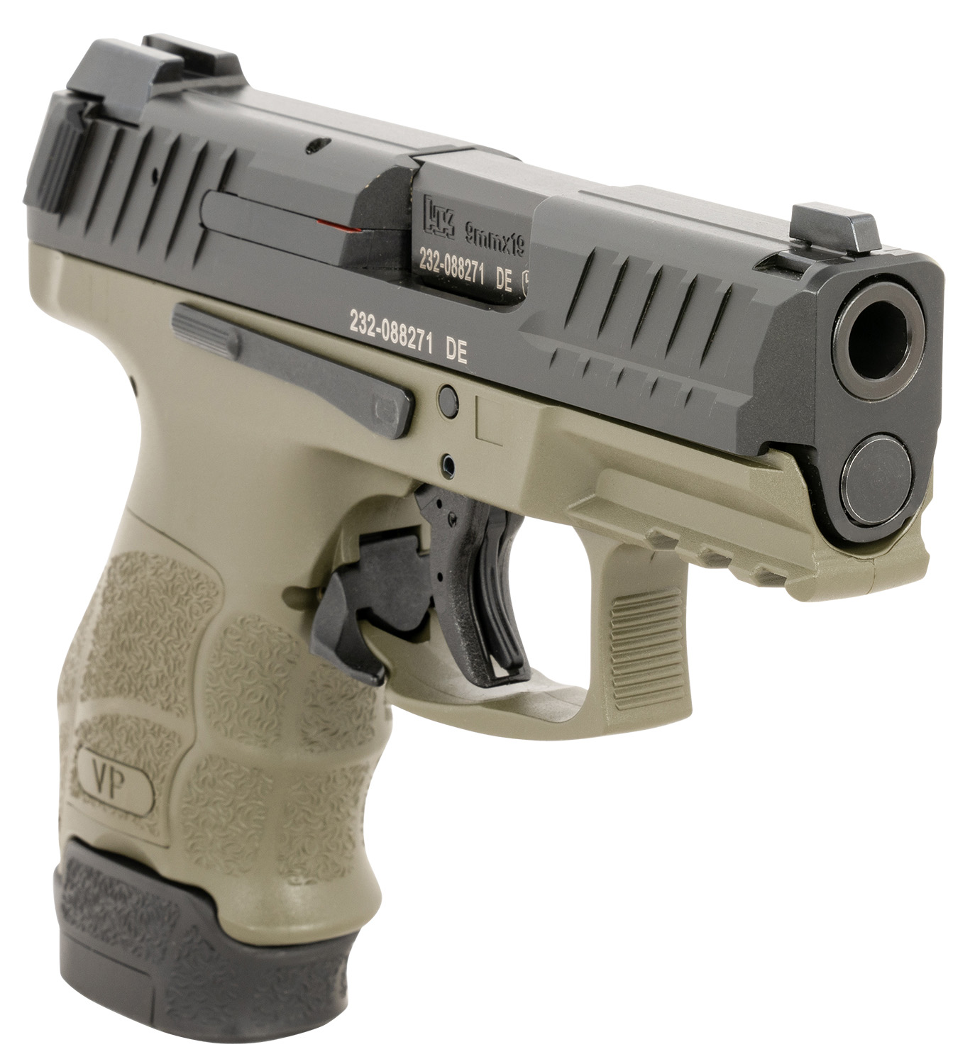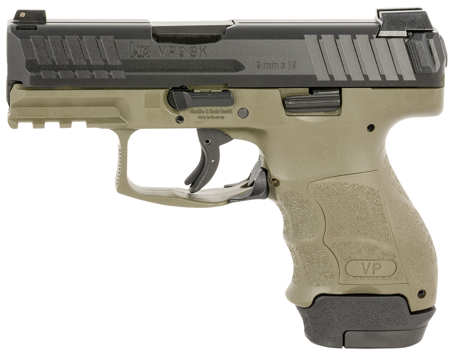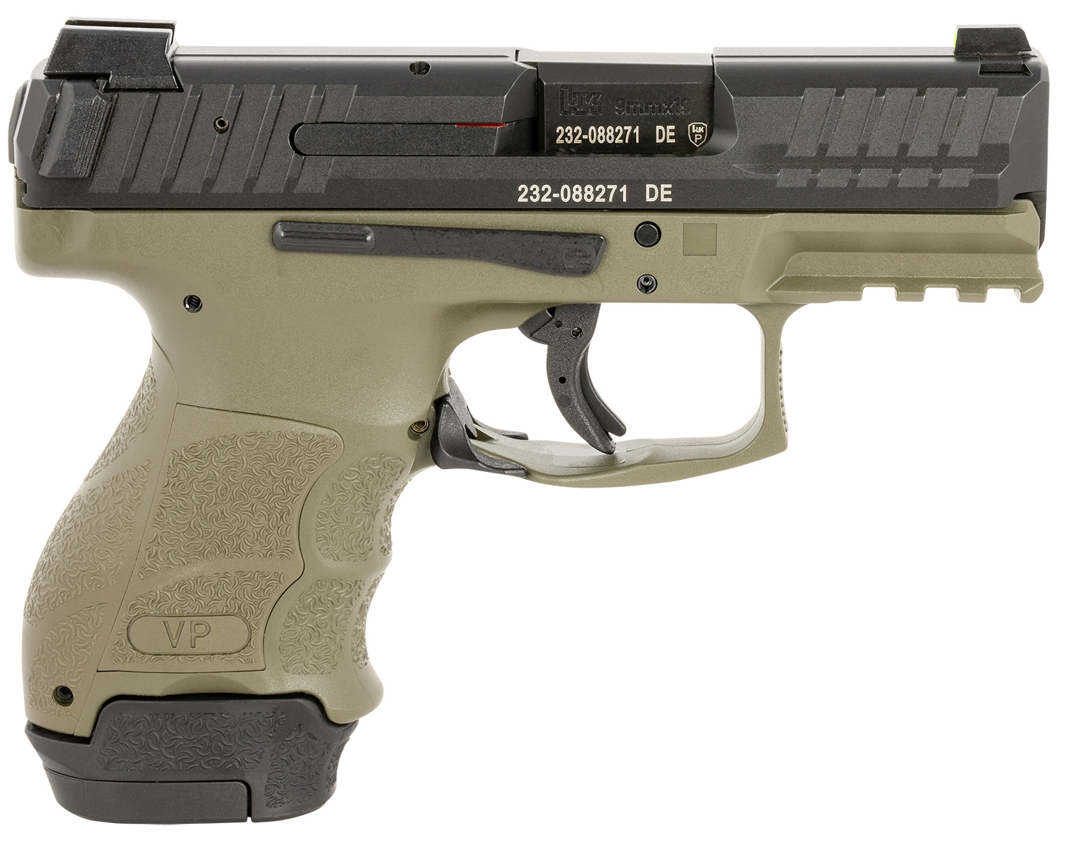 HK 81000814 VP9SK Subcompact 9mm Luger 12+1/15+1 3.39″ Serrated Slide, Green Polymer Frame w/Picatinny Rail, Black Finger Grooved w/Interchangeable Backstrap Grips Ambidextrous