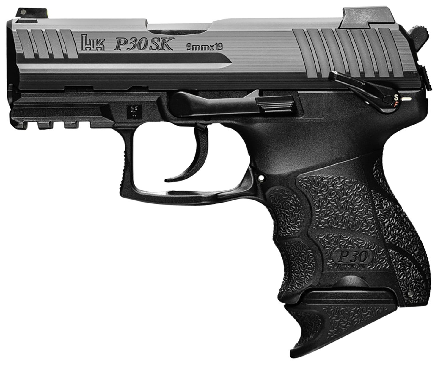 HK 81000825 P30SK Sub-Compact 9mm Luger 15+1 3.27″ Black Matte Stainless Serrated Slide Black Polymer Frame w/Picatinny Rail Black Finger Grooved Polymer Grips Ambidextrous Hand