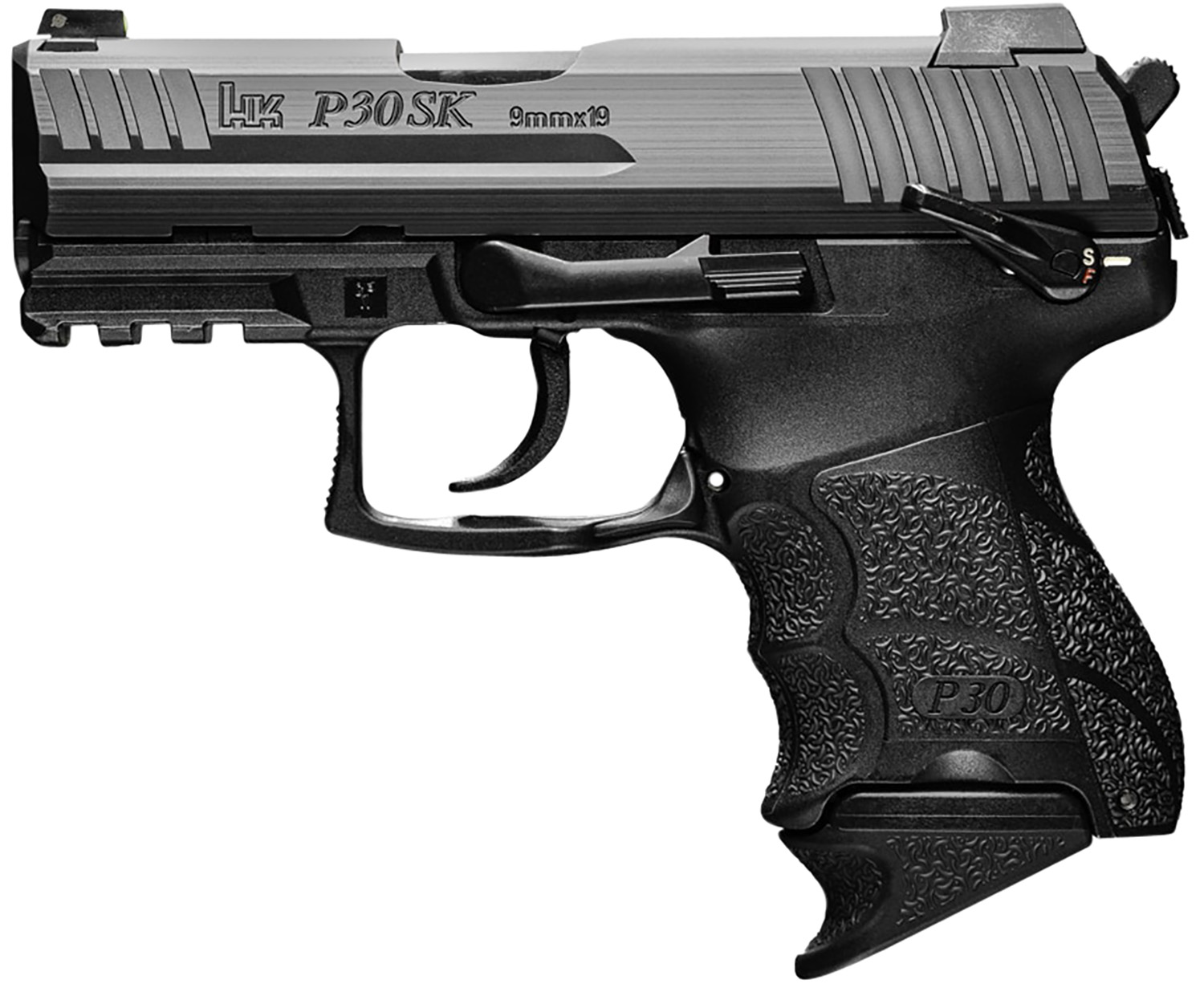 HK 81000826 P30SK Sub-Compact 9mm Luger 15+1 3.27″ Black Matte Stainless Serrated Slide Black Polymer Frame w/Picatinny Rail Black Finger Grooved Polymer Grips Ambidextrous Hand