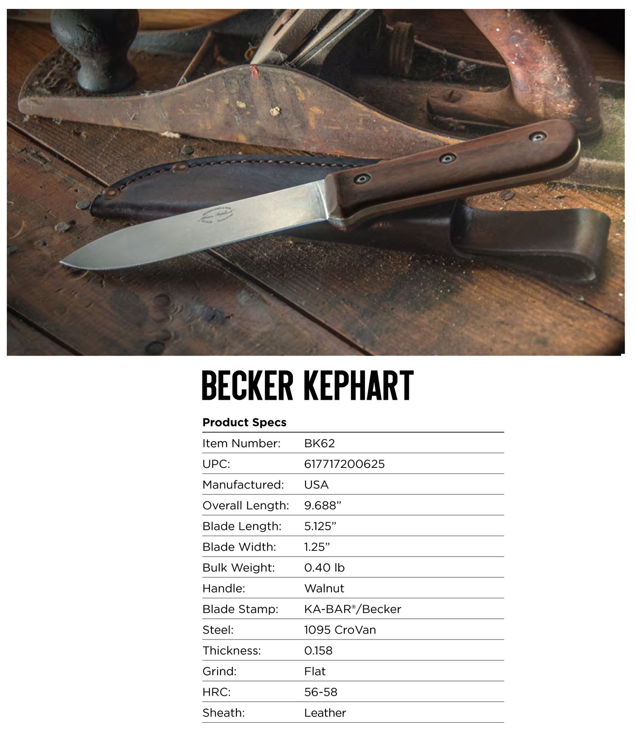 Ka-Bar BK62 Becker Kephart 5.13″ Fixed Drop Point Plain Satin Stonewashed 1095 Cro-Van Blade, Walnut Handle, Includes Sheath