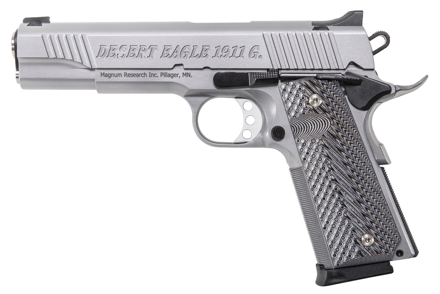 Magnum Research DE1911GSS 1911G 45 ACP 8+1, 5.01″ Stainless Steel Bull Barrel, Matte Stainless Steel Serrated Slide & Frame w/Beavertail, Black/Gray G10 Grip, Grip Safety, Right Hand