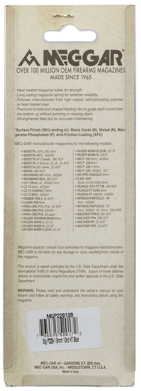 Mec-Gar MGP22910B Standard 10rd 9mm Luger Fits Sig P229 Blued Carbon Steel