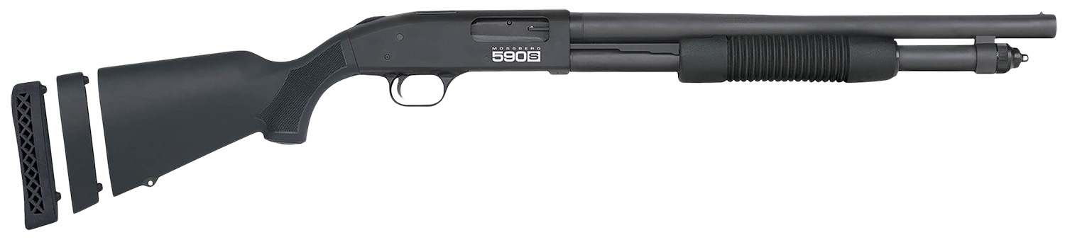 Mossberg 51607 590S Compact 12 Gauge Pump 3″ 5+1 18.50″ Matte Blued Steel Barrel, Black Drilled & Tapped Receiver, Adjustable LOP Black Synthetic Stock