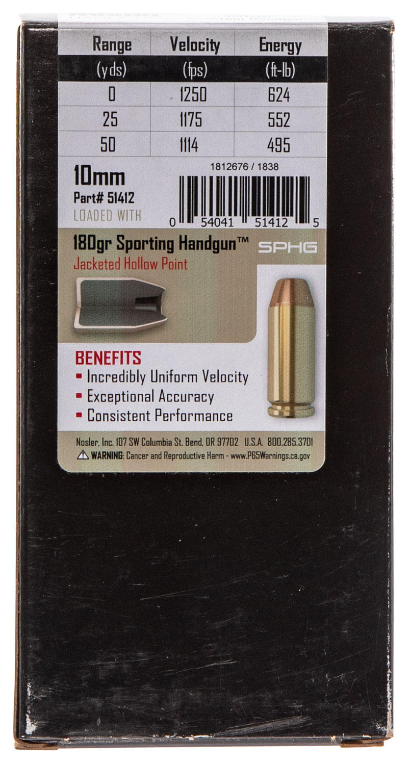 Nosler 51412 Assured Stopping Power Handgun 10mmAuto 180gr Jacketed Hollow Point 50 Per Box/10 Case