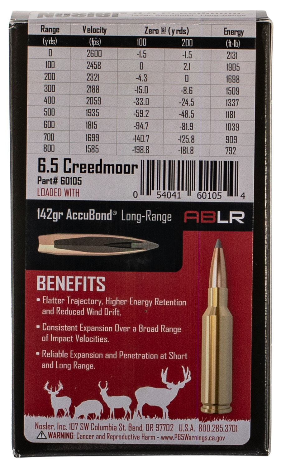 Nosler 60105 Trophy Grade Long-Range 6.5Creedmoor 142gr Nosler Spitzer AccuBond Long Range 20 Per Box/10 Case